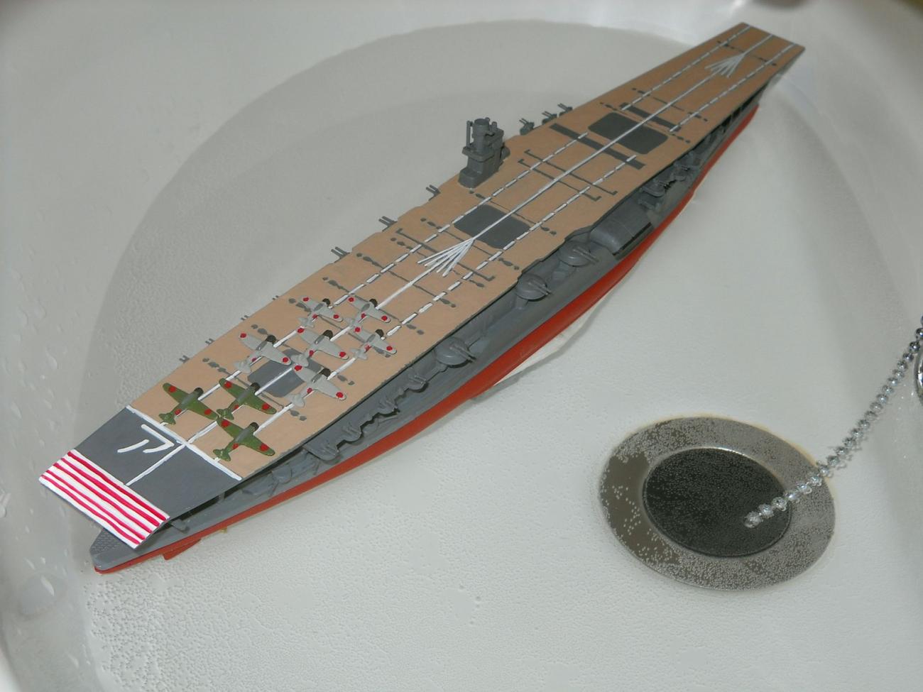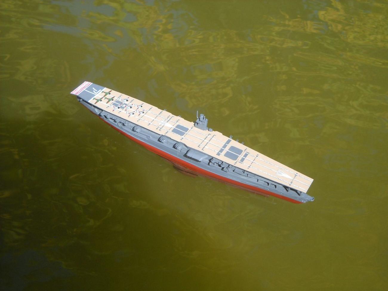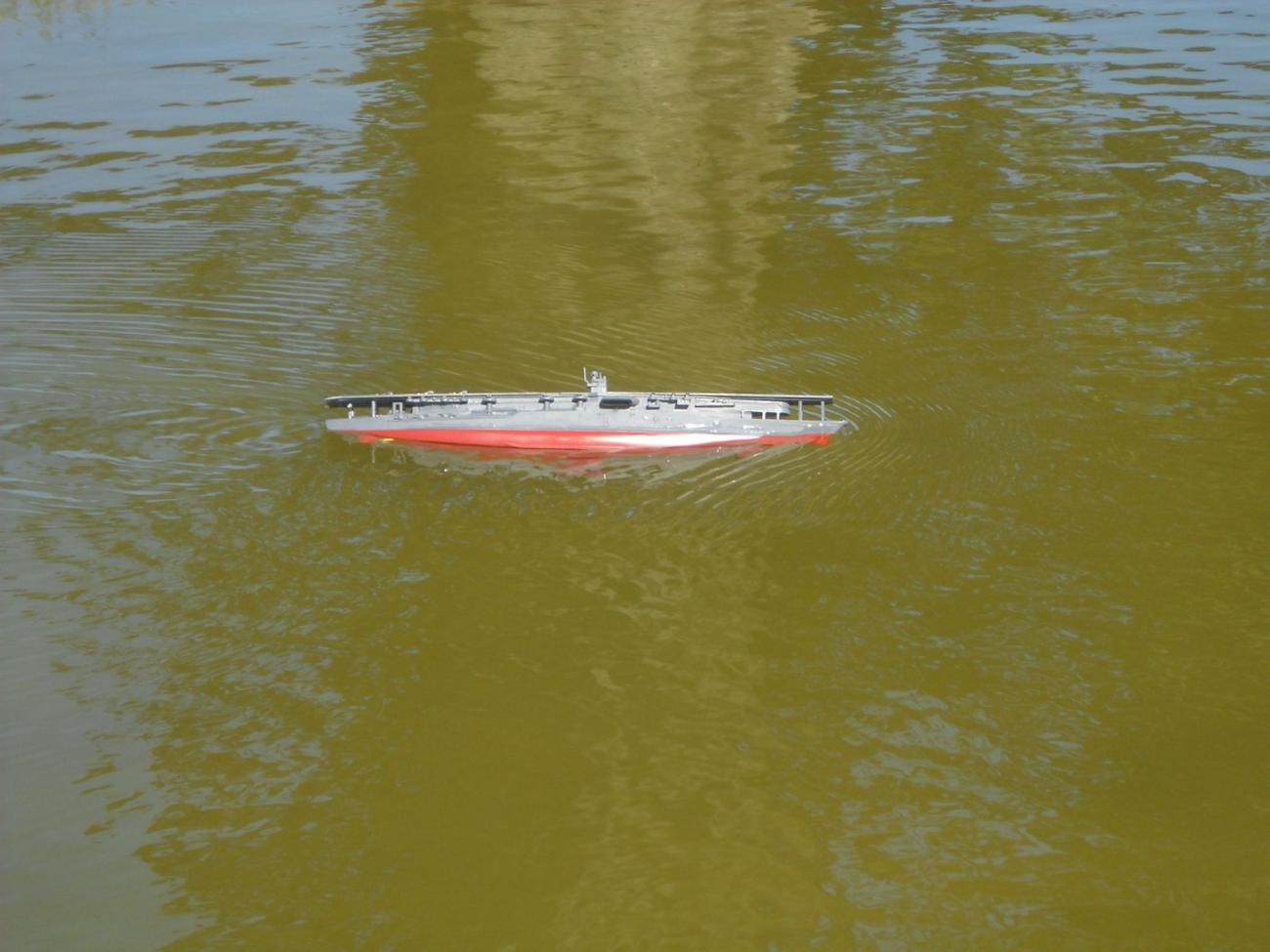 Hotový Bismarck se po spuštění na vodu v umyvadle a ve vaně choval uspokojivě. S Akagi jsem však zažil nečekaně velké komplikace. Trup byl ponořen příliš hluboko, takže loďka působila jako napůl potopená, a navíc se chovala labilně. Z kalkulací a testů vyplynulo, že nepomůže sebevětší odlehčení a jedinou šancí, jak dosáhnout, aby model působil na hladině přirozeně, bylo nějakým způsobem uměle zvýšit vztlak a stabilitu. S tou jsem se již předtím na jiném modelu potýkal a měl tedy po ruce řešení (balast na magnet pod trup). S prvně jmenovaným problémem jsem se však setkal poprvé. Nakonec jsem si poradil pomocí jednoduchého plováku z XPS přichyceného pod trup magnety. Směrem dolů z plováku vybíhá kýlová ploutev se zátěží z olůvka. Jelikož se trup při první zkušební plavbě stále nakláněl, byla posléze stabilita vylepšena prodloužením kýlové ploutve. Popsaný přípravek je možno přichytit i pod trup Bismarcka. Ten je sice stabilní dost a obejde se i bez něj, avšak jeho ponor je přeci jen o trochu vyšší, než by měl být. S pomocí plováku se čára ponoru dostane do správné pozice a model tím pádem při plavbě působí na pohled lépe.