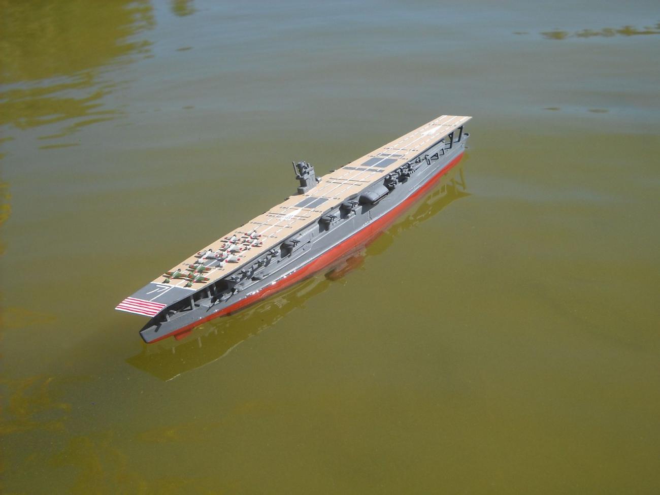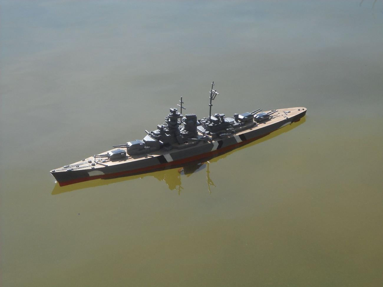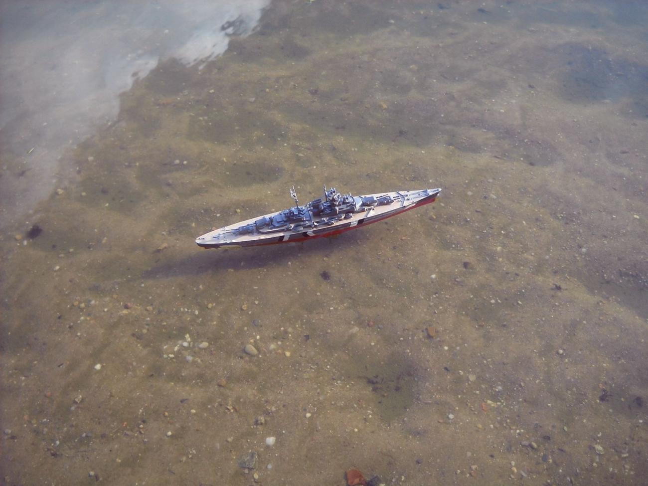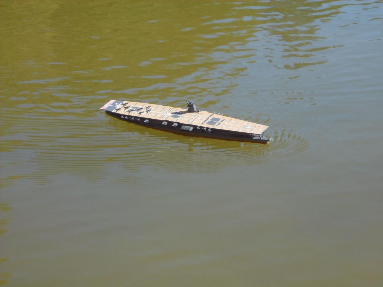 Hotový Bismarck se po spuštění na vodu v umyvadle a ve vaně choval uspokojivě. S Akagi jsem však zažil nečekaně velké komplikace. Trup byl ponořen příliš hluboko, takže loďka působila jako napůl potopená, a navíc se chovala labilně. Z kalkulací a testů vyplynulo, že nepomůže sebevětší odlehčení a jedinou šancí, jak dosáhnout, aby model působil na hladině přirozeně, bylo nějakým způsobem uměle zvýšit vztlak a stabilitu. S tou jsem se již předtím na jiném modelu potýkal a měl tedy po ruce řešení (balast na magnet pod trup). S prvně jmenovaným problémem jsem se však setkal poprvé. Nakonec jsem si poradil pomocí jednoduchého plováku z XPS přichyceného pod trup magnety. Směrem dolů z plováku vybíhá kýlová ploutev se zátěží z olůvka. Jelikož se trup při první zkušební plavbě stále nakláněl, byla posléze stabilita vylepšena prodloužením kýlové ploutve. Popsaný přípravek je možno přichytit i pod trup Bismarcka. Ten je sice stabilní dost a obejde se i bez něj, avšak jeho ponor je přeci jen o trochu vyšší, než by měl být. S pomocí plováku se čára ponoru dostane do správné pozice a model tím pádem při plavbě působí na pohled lépe.