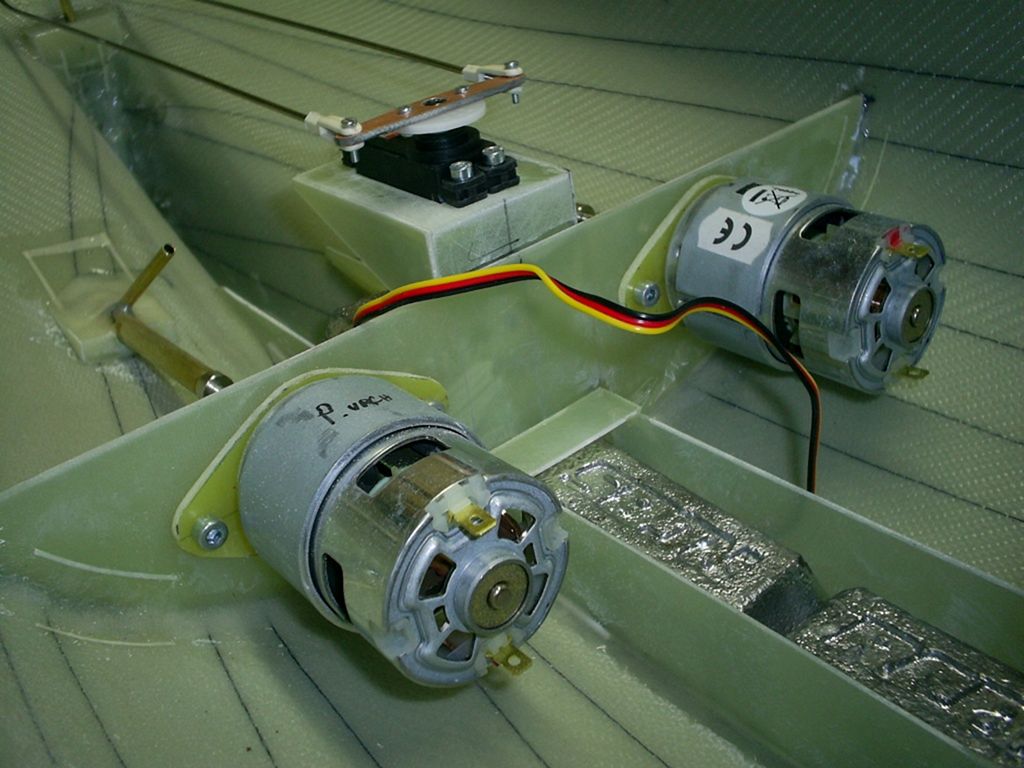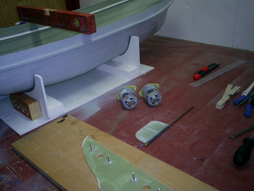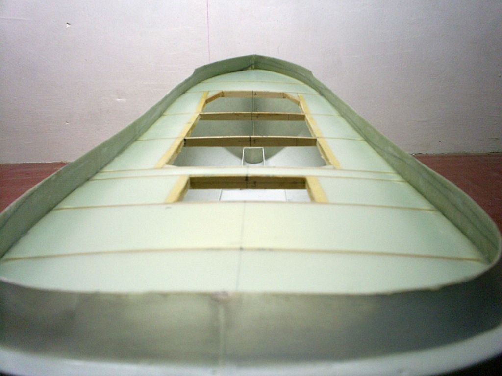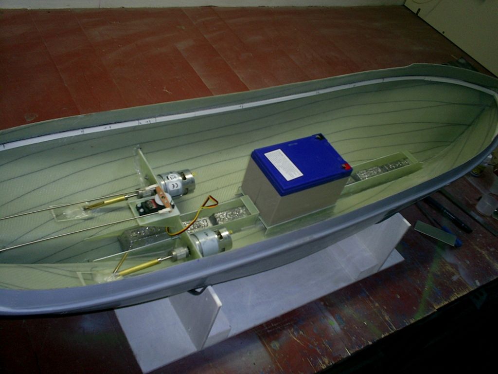 V současné fázi stavby modelu se po usazení pohonů a ovládání kormidla pracuje na trupových žebrech pro umístění baterie a zátěže, lícování prošlupu paluby, manipulačních otvorů a přesné dosazení nástaveb.