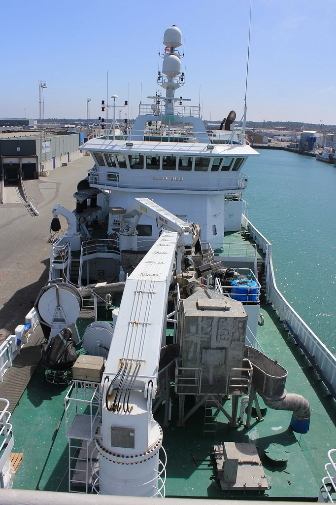 Při prezentaci, kterou provádí občas i školám, nám ukázal, kde všude loví, jakým způsobem loví a základní parametry lodi (www.karstensens.dk/en/newbuildings/pelagic-trawlers/newbuilding-397-isafold.html). Následoval výstup na kapitánský můstek. Zde jsme si alespoň na chvíli všichni poseděli v křesle kapitána a vychutnali si ten pohled z něho. Prošel s námi celý vnitřek lodi, byli jsme až u motorů pro přední boční pohon. Kluky nejvíce zajímal motor, ale zaujal je i soustruh, který našli v údržbářské dílně. Mně ale nejvíce zajímala paluba a vše na ní. Vnitřek lodi stavět určitě nebudu. Dočkal jsem se. S kapitánem a dětmi jsem se viděl ještě chvilku, ale potom jsem se „utrhl“. Prolezl jsem si na lodi, co se dalo. Od zadní části k přídi. Fotoaparát jen cvakal. Vylezl jsem na stožáry, kam až jsem si troufl, a nevnímal čas a nikoho kolem sebe. Asi po 2 hodinách pobytu na lodi mi děti oznámily, že jdou do města, kde se potom potkáme. Prošel jsem si ještě zbývající část lodi a společně s kapitánem odjel do města za dětmi.