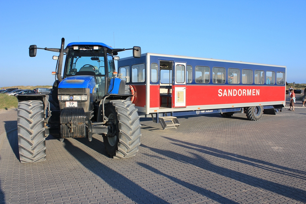 Ale byl čas jít, chtěli jsme ještě stihnout Grenen - opravdu nejsevernější místo Dánska. Jde o výběžek, kde se stýká Severní a Baltské moře. Na poprvé jsme se netrefili na správnou cestu, tak jsme alespoň smočili nohy v moři - tentokrát Baltském. Nakonec jsme správnou cestu úspěšně našli a dorazili na parkoviště. Pěšky po pobřeží Baltského moře jsme asi po 2 km dorazili na souběh obou moří. Dál už to nešlo. Představa, že půjdeme zpět k autu stejnou cestou, byla hrozná. Naštěstí bylo asi 10 minut do odjezdu traktoru s vlekem, který vozí turisty mezi parkovištěm a tímto místem. Takže rychle foto a už sedíme ve vleku a jedeme zpět k autu. Chvílemi měl traktor v jemném písku co dělat a my jen čekali, kdy půjdeme tlačit. Ale to se nestalo.