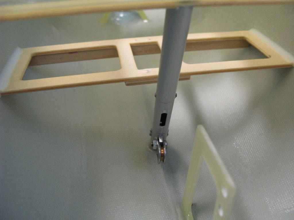 Pro servo kormidla (HS 646WP) je jednoduše přilepená, vyztužená deska z 3mm topolové překližky, opět napuštěná pryskyřicí. Servo s kormidlem je spojené pomocí dvouramenných, pák a dvou táhel - to zabezpečí, že kormidlo funguje prakticky bez vůle.