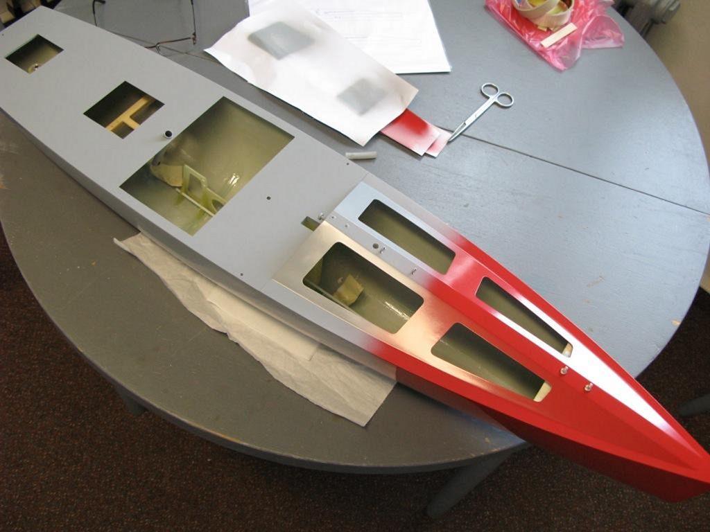 Tím jsem vlastně dokončil laminování všech potřebných dílů, protože zadní část paluby je vyrobená z 0,5mm laminátové desky. Oproti originálu Noux je tedy zadní část paluby rovná, zvednutá směrem nahoru a tím se posune lehce i těžiště oplachtění směrem vzhůru. To není sice optimální (měřící bod na palubě vztahující se ke stěžni, je tedy výše - viz IOM rules), ale bylo to vynucené plánovaným způsobem ovládáním otěží - servo s velkou (100 mm průměr) kladkou. Pod palubou je umístěná „falšpaluba“ z 3mm topolové překližky, vystrouhaná na CNC a následně napuštěná pryskyřicí. Po přilepení k trupu vteřinovým lepidlem, je odspodu po celém obvodu přilaminovaná rovingem ze skelných vláken. Tímto se celý obvod trupu výrazně zpevní.