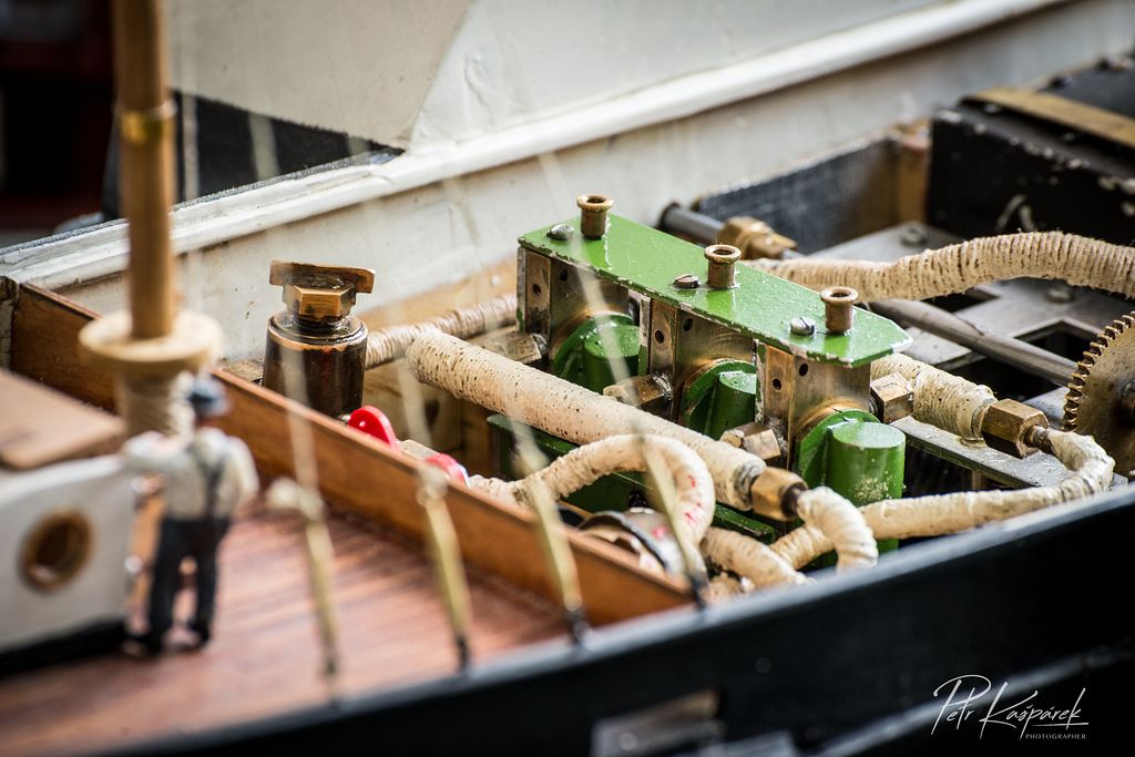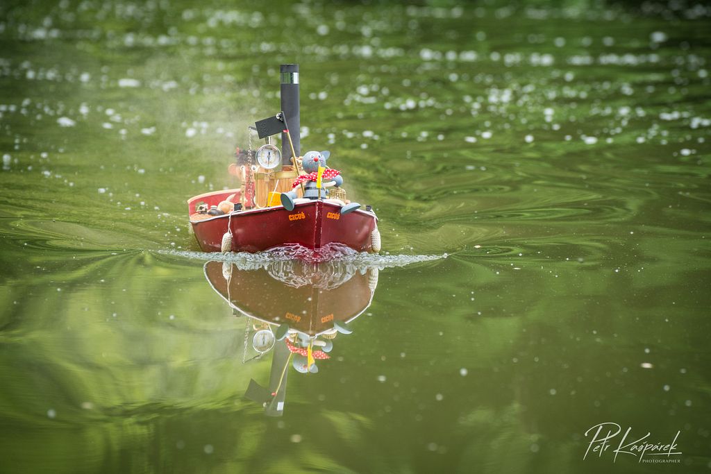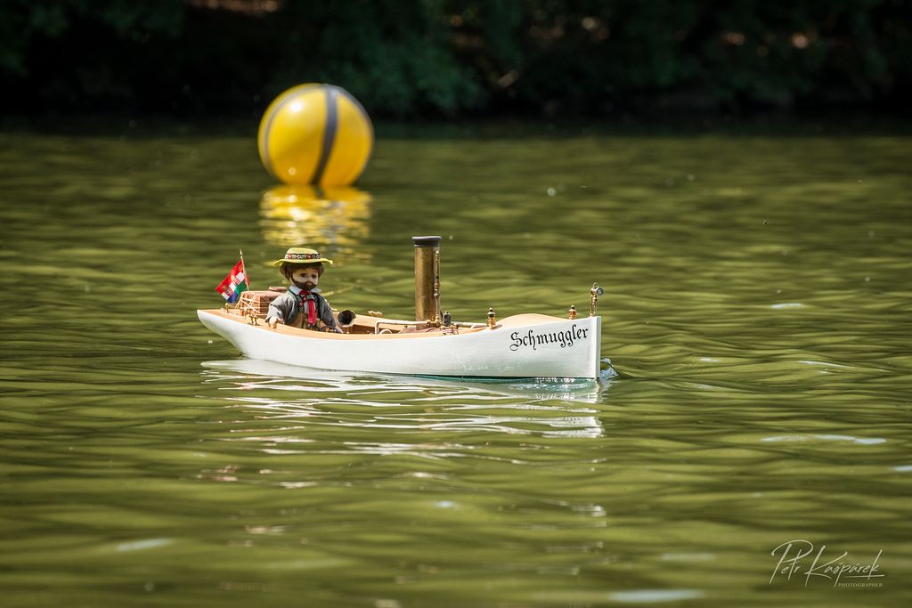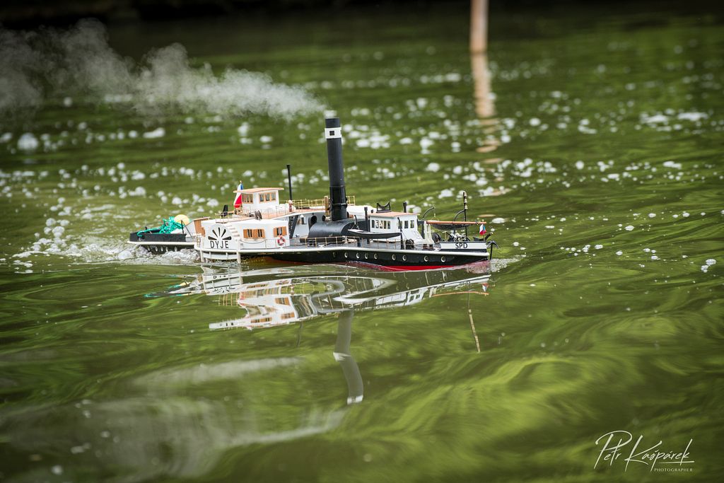 Poté do půlhodinového souboje vyplulo 13 parníků s lodním šroubem. Mezi nimi i můj Tollman, který sice rychlostní rekordy netrhá, ale vydrží plout takovou dobu. Co čert nechtěl, ještě před odstartováním se zastavil, když jsem chtěl kousek zacouvat. Až v klidu domova jsem spíše náhodou zjistil, že se na klikové hřídeli povolil červík a jeden z válců šlape naprázdno. Na stole vše fungovalo, protáčení nastalo až ve vodě.