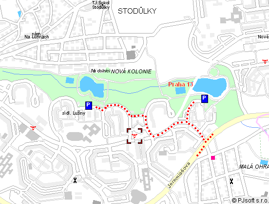 Parkovat lze cca 50 metrů od nádrže (nejlépe v ulici K Zahrádkám).