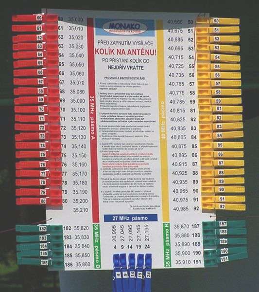 i s kolíčky. Každý, kdo bude chtít zapnout RC vysílač, MUSÍ MÍT na anténě připnutý kolíček z této tabule s příslušným kanálem. Pokud kolíček na tabuli není, NESMÍTE vysílač ani krátkodobě zapnout! Prosím, dodržujte tento systém. Vyvarujete se poškození vlastního nebo cizího modelu! Toto opatření samozřejmě neplatí pro systémy s frekvencí 2,4 GHz (majitelé těchto souprav označí svou anténu libovolným kolíčkem z jinak zakázaného pásma 35 MHz).