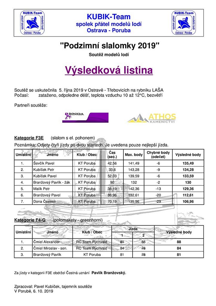 Spolek přátel modelů lodí – KUBIK-Team z Poruby měl v plánu sezónu ukončit, opět jako vloni, soutěží PODZIMNÍ SLALOMKY 2019. Ovšem, člověk míní a osud mění. A tak letos byly konce sezóny dva. Ale ani jeden nebyl příliš radostný. Takže popořadě.