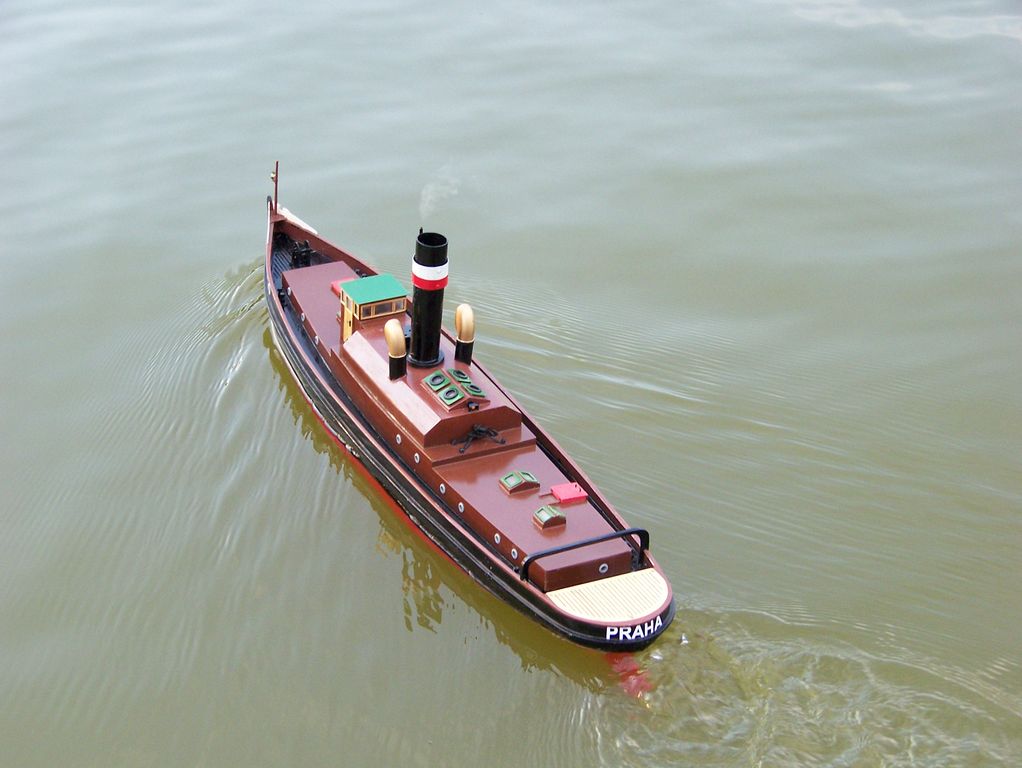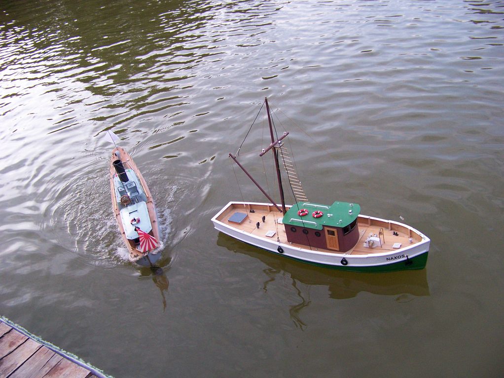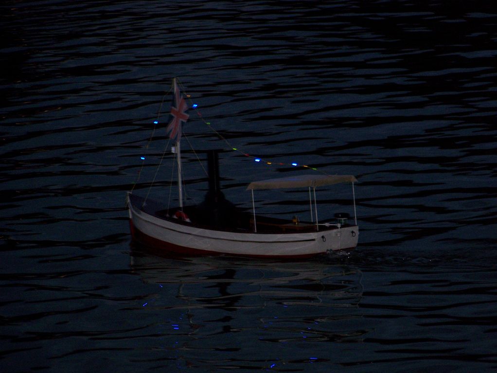 Shodou okolností se mi povedlo přemluvit pár kolegů z KLoM Písek, a tak byl můj vůz po dlouhé době naložen až po okraj. Jelikož Jiří Voráček bydlí poblíž Lán, neodolali jsme malé exkurzi do loděnic žijící modelářské legendy, kde vznikají modelářské parní strojky, kotlíky a parníčky. Protože jsme dorazili příliš brzy, nestihl však připravit parníky k vodě, a tak vyrazil s osvětleným exparníkem. Tuším, že jde o Kirishimu.