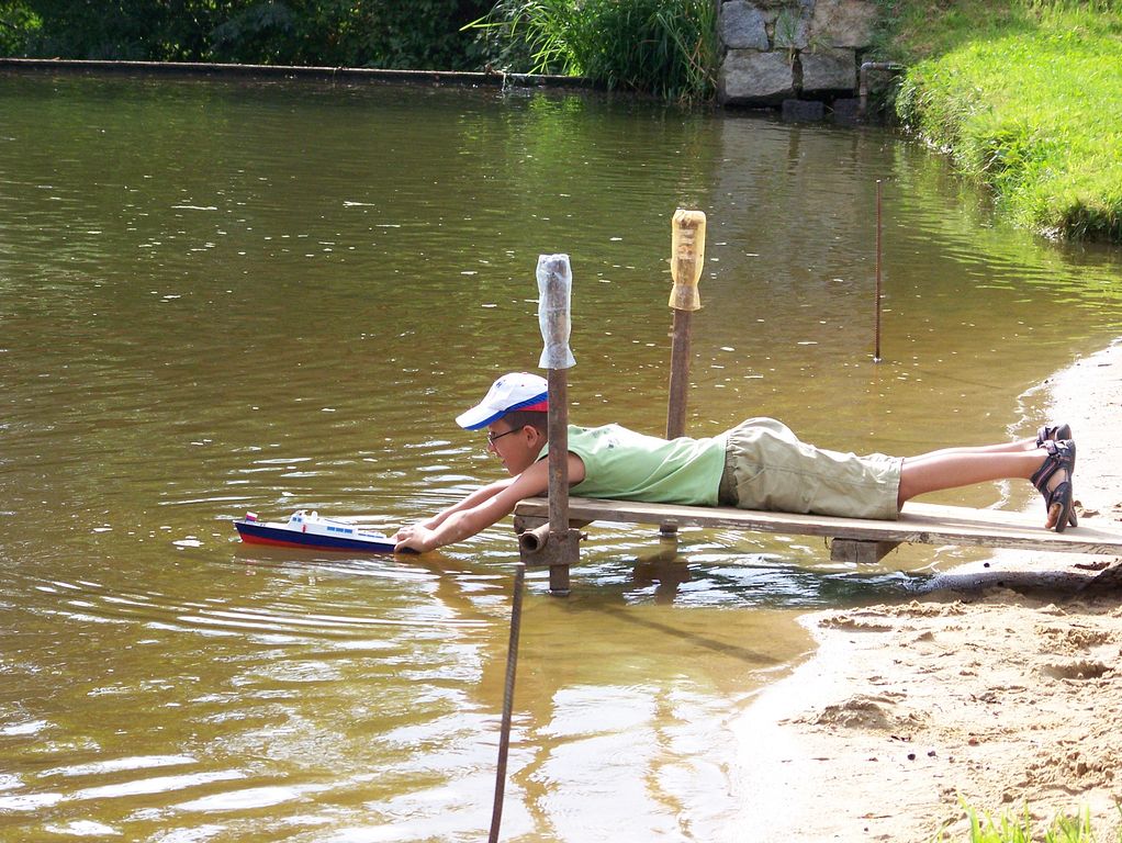 Na místo samé se mi podařilo přijet z blbé strany, neboť poblíž rybníku Lazna zrovna silničáři opravovali most tím stylem, že silnice z obou stran končila nad vybagrovaným údolím. A já samozřejmě přijel z té špatné. 400 metrů s modelem v ruce ještě nikoho nezabilo, a tak jsem několikakilometrové objíždění zavrhl jako zbytečné plýtvání. Po chvíli se ukázalo, že podobné štěstí s volbou příjezdové trasy měli i jiní, a tak bylo co chvíli vidět nějakého modeláře, kráčejícího s bednou přes hráz.