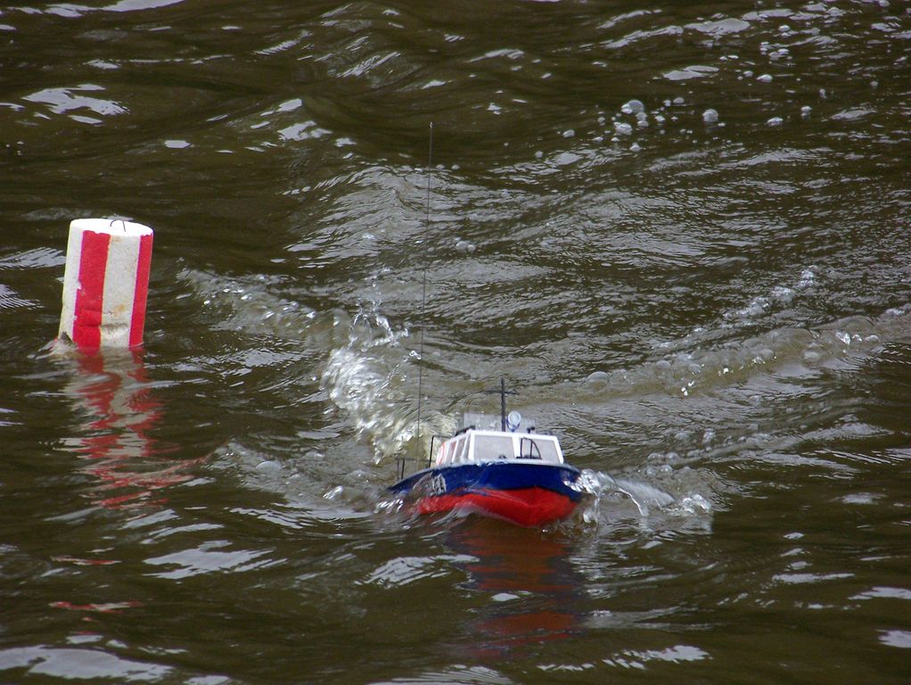 Po F4-A seniorů následovaly skromně obsazené F2-A a F4-B. Tom Hlach, kterého z článků na MoNaKu již znáte, nasadil během dne hned tři modely. Nejprve laboroval s pohonem policejního člunu do F4-A, aby v dalších kategoriích nasadil USS Chevalier a Neptuna. Na jízdu USS Chevalier jsem čekal celou dobu, ovšem ani jsem ji nestihl postřehnout. První, co jsem zaregistroval, bylo volání o svážecí loď a skok Toma Hlacha do vody. Asi byly vlny moc velké.