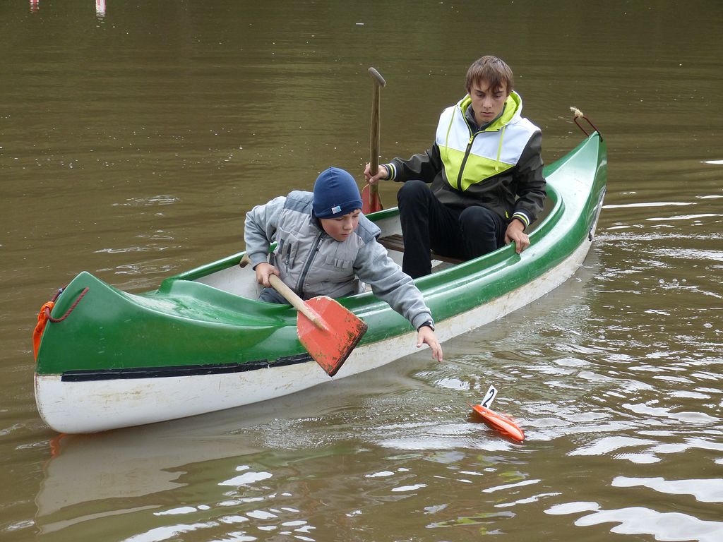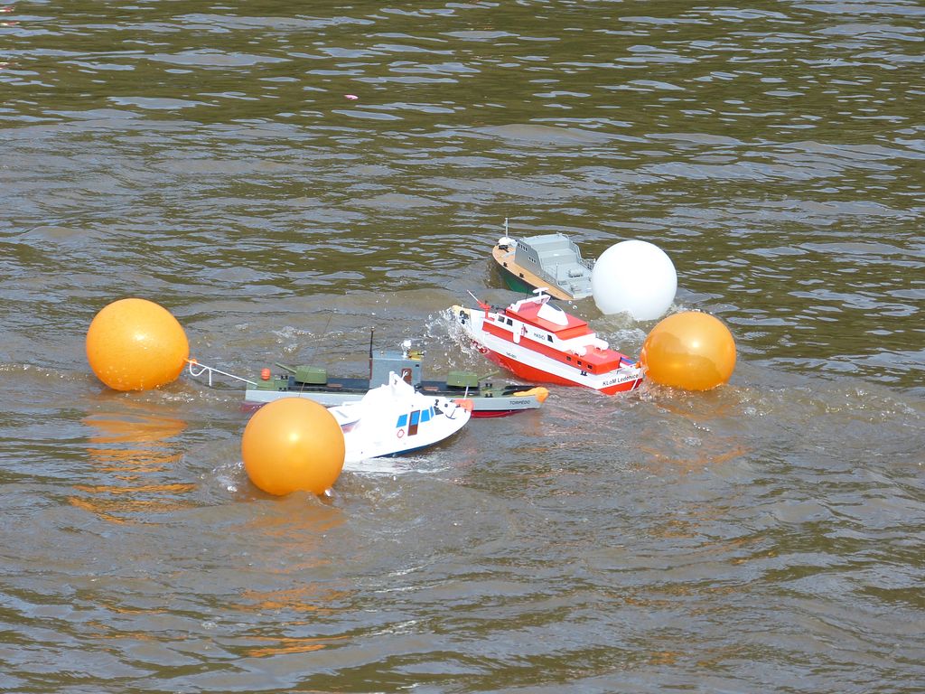 Konkurovat tomu mohlo pouze klání o Piráta roku 2012, ve kterém každý modelář vyjel do bojů se špendlíkem na přídi a balónkem na zádi s jasným cílem - přečkat se svým balónkem až do konce. Přestože je to lákadlo hlavně pro juniory, své modely se odhodlali ničit i senioři. Se svým Springerem jsem se rovněž zapojil, avšak bál jsem se, abych lehkotonážní plavidla soupeřů neposlal ke dnu, a tak jsem se bojům spíše vyhýbal. Po chvilce mi však upadl špendlík do vody, čímž bylo o rychlém konci mého plavidla rozhodnuto - Springer bez špendlíku cizí balónek nepropíchne![]()