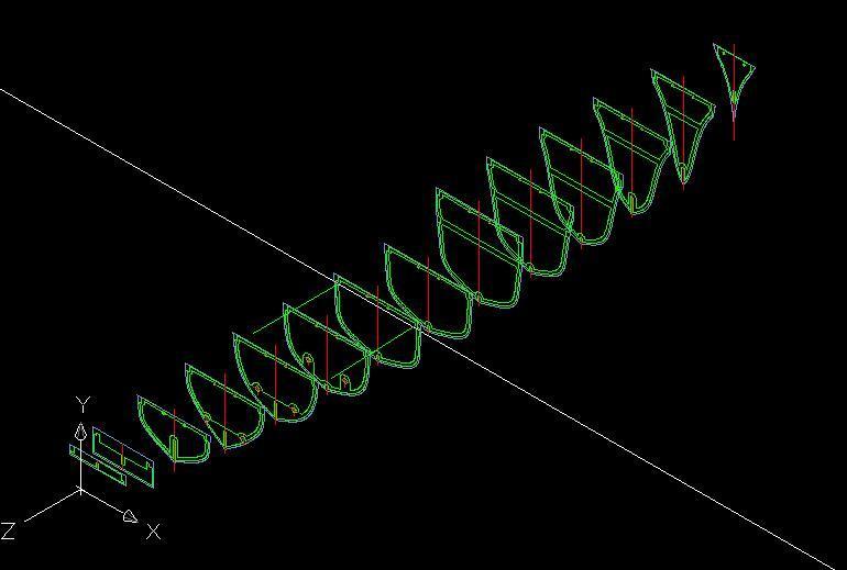 až jsem je dostal na pozice žeber modelu. Nakreslil tvary žeber, vytiskl, nalepil na překližku a vyřízl. Zobrazení žeber