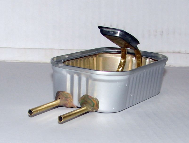 Co budete potřebovat? Nejdříve zajděte do obchodu, kde si koupíte krabičku sardinek v oleji, čokoládové bonbóny v plechové krabičce, pivo v plechovce a čínský luncheon-meat v krabičce podobné té od sardinek. Ještě doporučuji chleba nebo housku. Doma vše s maximální opatrností otevřete a snězte a vypijte. Prázdné obaly nevyhazujte, ale dejte do myčky. Pak ještě skákněte do nějakého „xHouse“, kde za pár korun koupíte mosaznou trubičku o průměru 5 mm. Pak ještě budete potřebovat epoxid 3-TON QUICK s kovovým plničem (vydrží až 120 °C), pájku, cín, kousek drátu a hodně fantasie. Pokud to všechno provedete v pátek (a nebude vám špatně od žaludku) v neděli už váš parníček může brázdit hladinu bazénu, umyvadla anebo jiné louže.