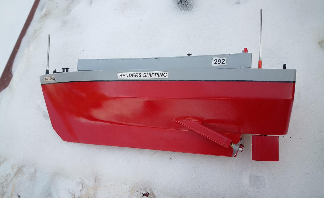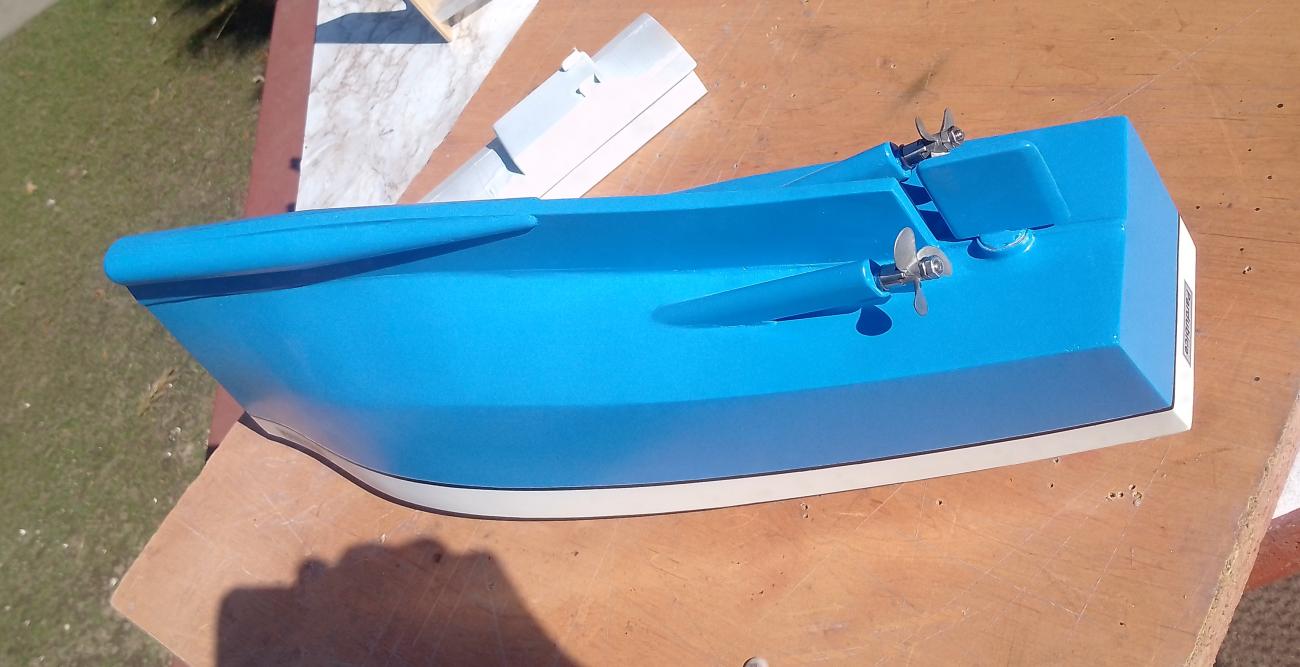 Od návrhu nové lodi jsem si sliboval zejména zlepšení stability při jízdě vpřed za silného větru a ve vlnách. Můj úspěšný model z roku 2024, má v pohledu zezadu trup tvaru „V“, a to v celé délce lodi. Ale vysledoval jsem, že při jízdě ve vlnách, má loď snahu se rozkývat ze strany na stranu. Proto jsem zkusil přepracovat záď lodi. Navrhl jsem vzadu plochý tvar, s mírným negativním úhlem směrem od kýlu (obrázek 03). Domníval jsem se, že to ploché dno na zádi stabilizuje loď při jízdě ve vlnách více, než trup tvaru V. Jenže jak se později ukázalo, změna tvaru zádi zlepšení nepřinesla. Naopak, nový design lodi přivodil více problémů na jiných místech. Což jsem zaznamenal během stavby samotné i během snahy o vylepšení jízdních vlastností později.