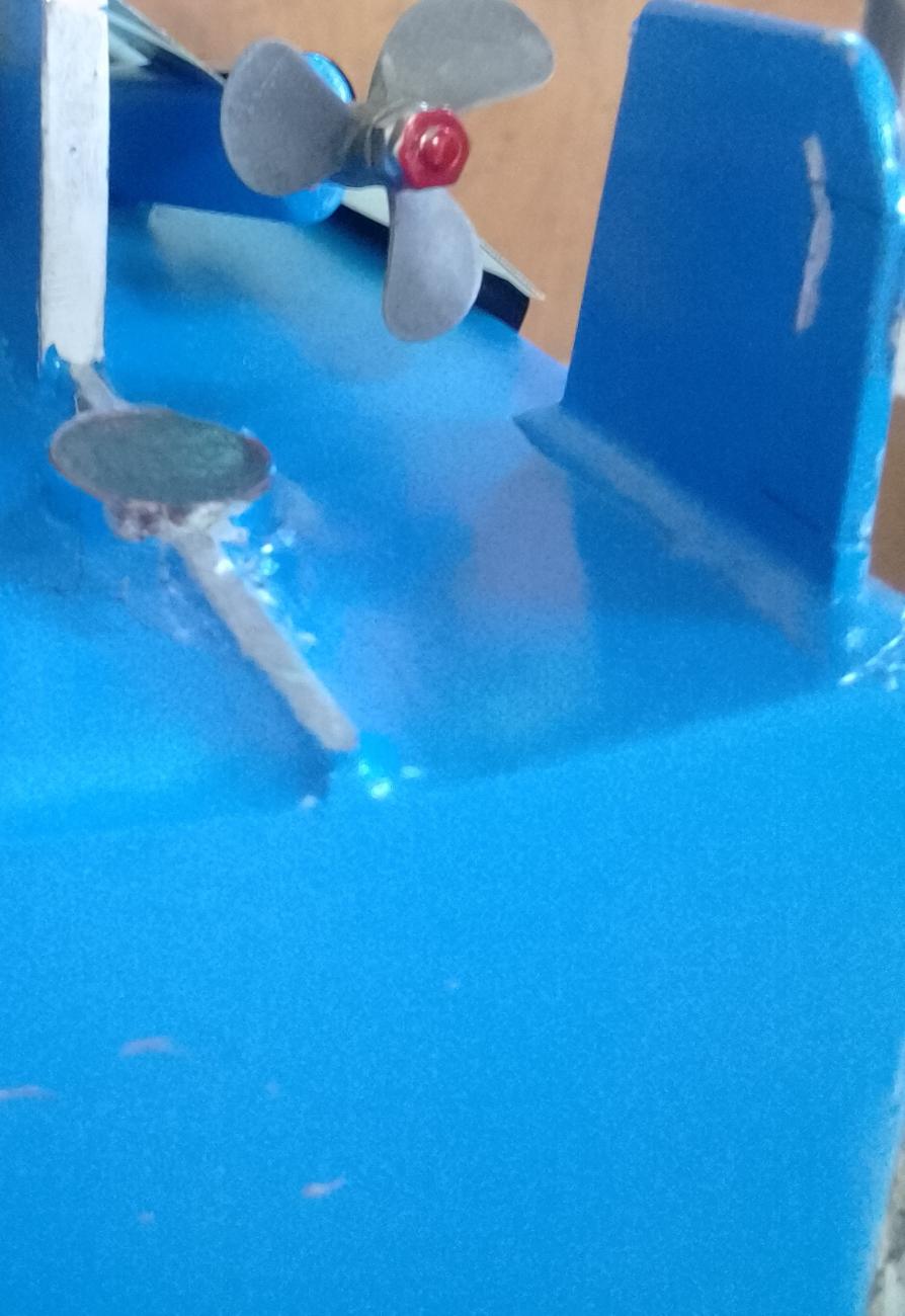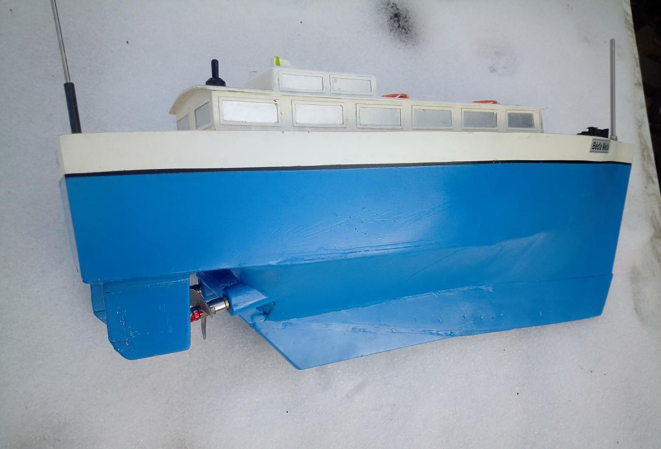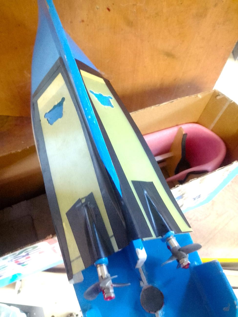 Přišlo září a já se rozhodl experiment s plavebními komorami na své lodi zrušit. Obě komory podél kýlu jsem vyplnil montážní pěnou. Na koncích u lodních šroubů jsem desky s pěnou seřízl a zatmelil. Konečnou podobu lodi je vidět na obrázku 22. Znovu a tentokrát už naposledy, jsem upravil převody ve své lodi. Tentokrát jsem použil ten nejsilnější motor, co mám. Navýšení počtu otáček na hřídelích ale zároveň vedlo k použití šroubů menšího průměru. Napadlo mě, že nestabilita zádi může být spojena s vířením pod plochým dnem lodi. Domníval jsem se, že použitá vrtule menšího průměru vyprodukuje víru méně než větší lodní šroub.