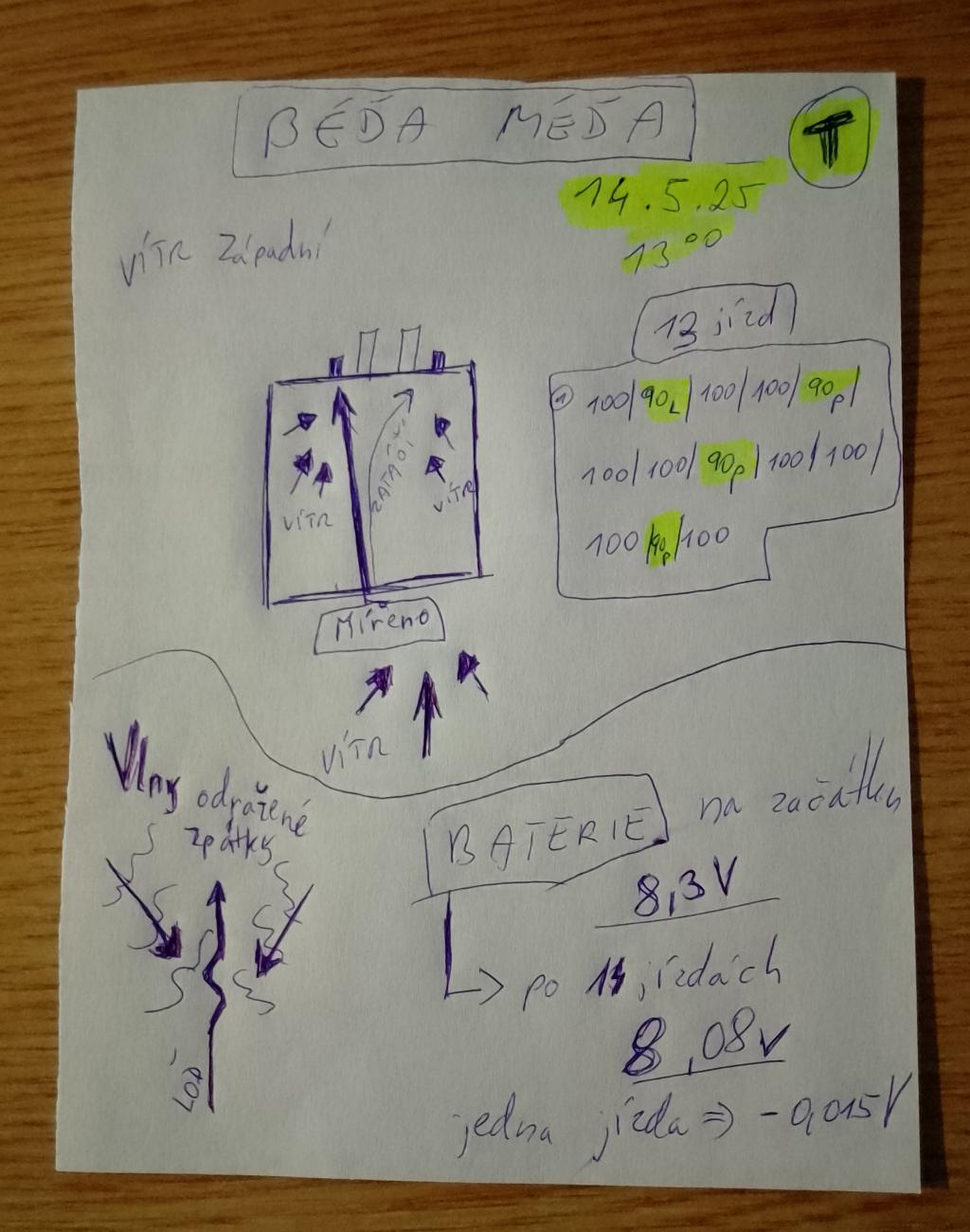 Zároveň jsem poprvé (a ne naposledy) změnil konfiguraci v převodech. Vyměnil jsem motor za jiný typ – s výsledným nižším počtem otáček. Tímto jsem svou loď o trochu zpomalil. Domníval jsem se, že nestabilita zádě se zvyšuje úměrně s rychlostí, se kterou se potká s odraženými vlnami od břehu. Po dalším kole testování, pouhé dva dny před závodem na Lučině, jsem byl s výsledkem celkem spokojen. Zápis z mého tréninku ze 14. května je na obrázku 18