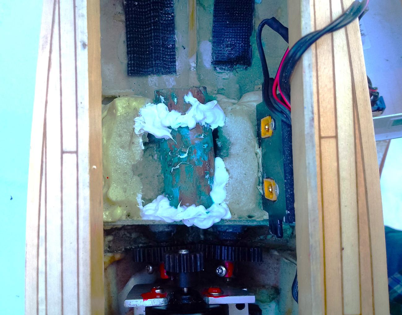 Další, v pořadí už čtvrté kolo závodů MP, se konalo už týden po Hlučíně. Tentokrát jsme vyrazili do Třebíče. Závody pětistovek na třebíčské nádrži Kuchyňka patří mezi mé nejoblíbenější a co se výsledků týče, tak i nejúspěšnější. Za poslední tři sezóny jsem zde zaznamenal postupně třetí, čtvrté a vloni dokonce první místo. Takže jsem se na závody velice těšil. Času tentokrát nebylo příliš, ale přesto jsem se do přestavby své pětistovky pustil. Už po několikáté jsem předělal strojovnu své lodi. Vrátil jsem se k osvědčenému způsobu pohonu lodních šroubů, tedy přes pastorek. Musel jsem změnit uložení pro motor a zkrátit hřídel levého lodního šroubu. Na prodloužené hřídeli byla původně napojena osička motoru. Výsledný převod tedy je 1:3 a znovu se silnějším, více otáčkovým motorem. K tomu jsem změnil také průměr svých lodních šroubů, na největší velikost, kterou mám. Zároveň jsem dospěl k myšlence, že vliv nestability zádě může být způsobený přenosem vibrací od motoru na lodní šrouby. A tak jsem použil montážní pěnu. Prostor uvnitř lodi, mezi hřídeli, jsem vyplnil montážní pěnou. Na obrázku 20 je vidět převodové soukolí už s pastorkem. Zároveň je v montážní pěně vytvořen prostor pro další zátěž.