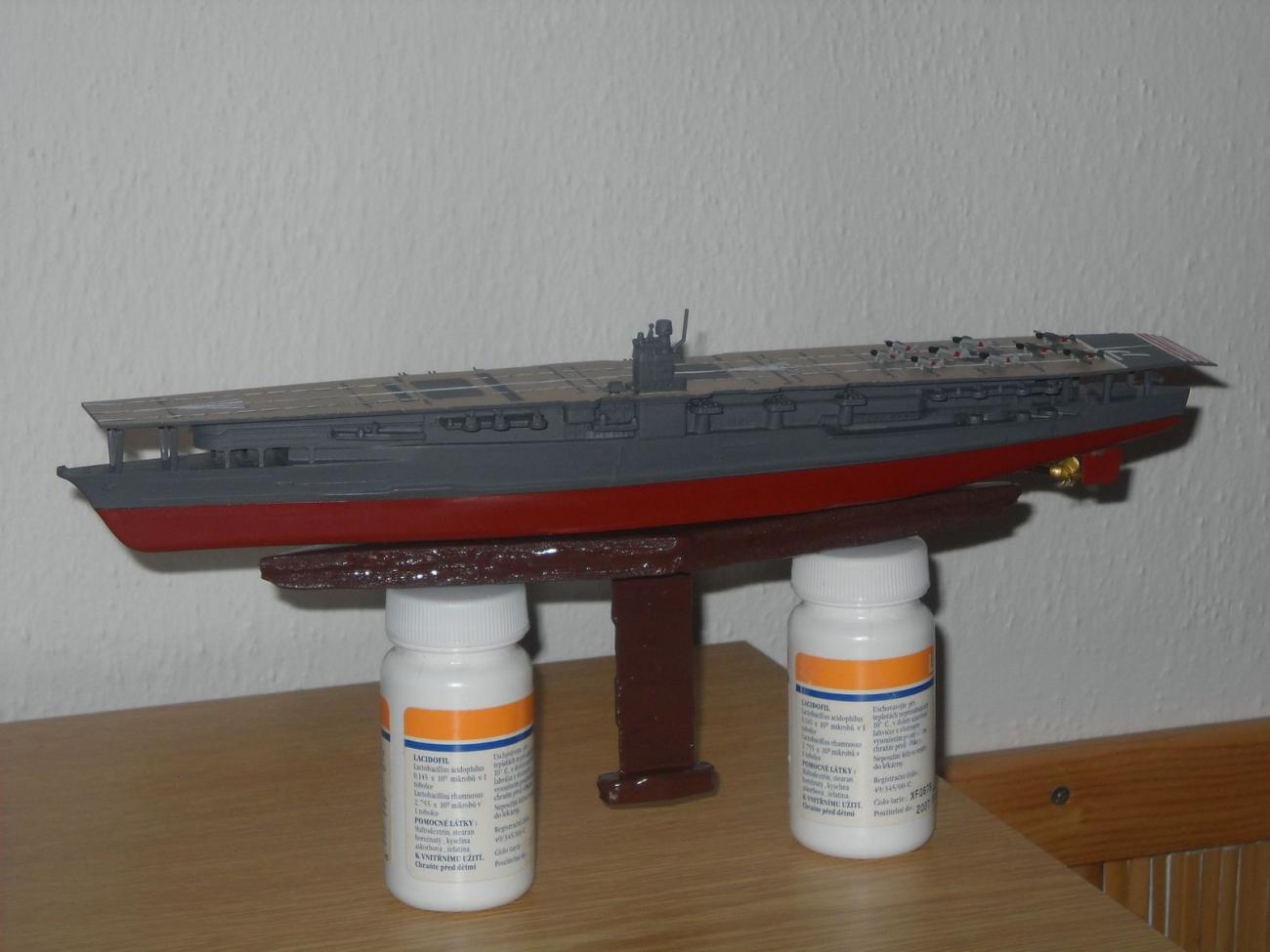 Hotový Bismarck se po spuštění na vodu v umyvadle a ve vaně choval uspokojivě. S Akagi jsem však zažil nečekaně velké komplikace. Trup byl ponořen příliš hluboko, takže loďka působila jako napůl potopená, a navíc se chovala labilně. Z kalkulací a testů vyplynulo, že nepomůže sebevětší odlehčení a jedinou šancí, jak dosáhnout, aby model působil na hladině přirozeně, bylo nějakým způsobem uměle zvýšit vztlak a stabilitu. S tou jsem se již předtím na jiném modelu potýkal a měl tedy po ruce řešení (balast na magnet pod trup). S prvně jmenovaným problémem jsem se však setkal poprvé. Nakonec jsem si poradil pomocí jednoduchého plováku z XPS přichyceného pod trup magnety. Směrem dolů z plováku vybíhá kýlová ploutev se zátěží z olůvka. Jelikož se trup při první zkušební plavbě stále nakláněl, byla posléze stabilita vylepšena prodloužením kýlové ploutve. Popsaný přípravek je možno přichytit i pod trup Bismarcka. Ten je sice stabilní dost a obejde se i bez něj, avšak jeho ponor je přeci jen o trochu vyšší, než by měl být. S pomocí plováku se čára ponoru dostane do správné pozice a model tím pádem při plavbě působí na pohled lépe.