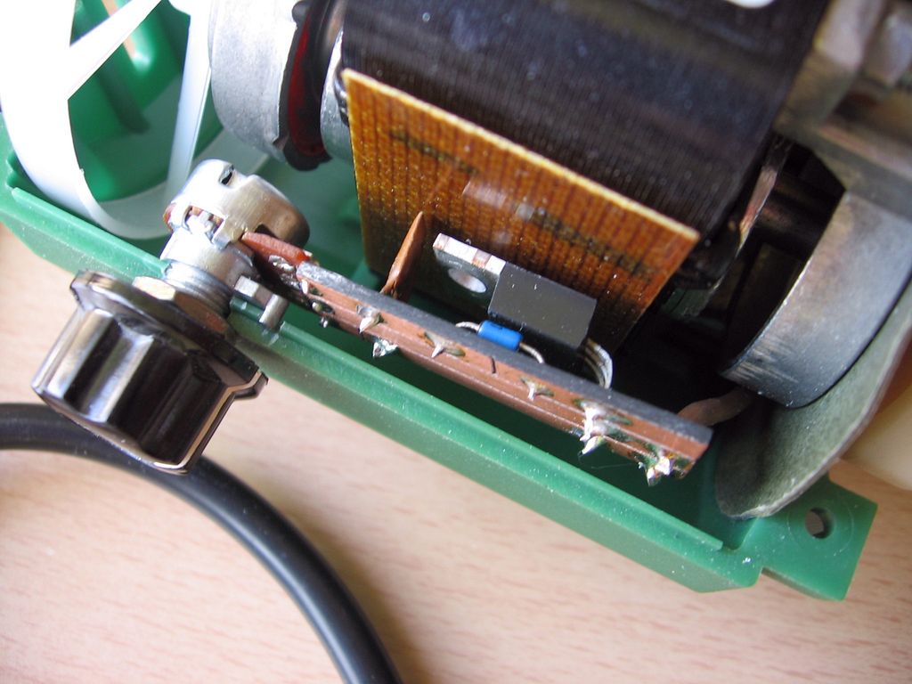 Brusku jsem rozebral, abych zjistil kolik je uvnitř místa. Chtěl jsem dovnitř umístit jednoduchý regulátor otáček. Místo bylo pouze v horní části krytu, ale pro umístění regulátoru stačilo. Regulátor se skládá z triaku TIC206M, diaku BD3, keramického kondenzátoru 33 nF a potenciometru 1 MΩ. Plošný spoj je vyroben z jednostranného kuprexitu a je pouze vyškrábán ocelovou rýsovací jehlou.