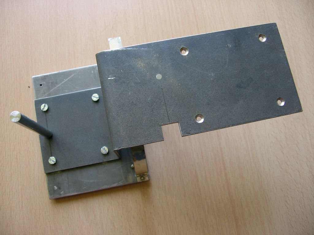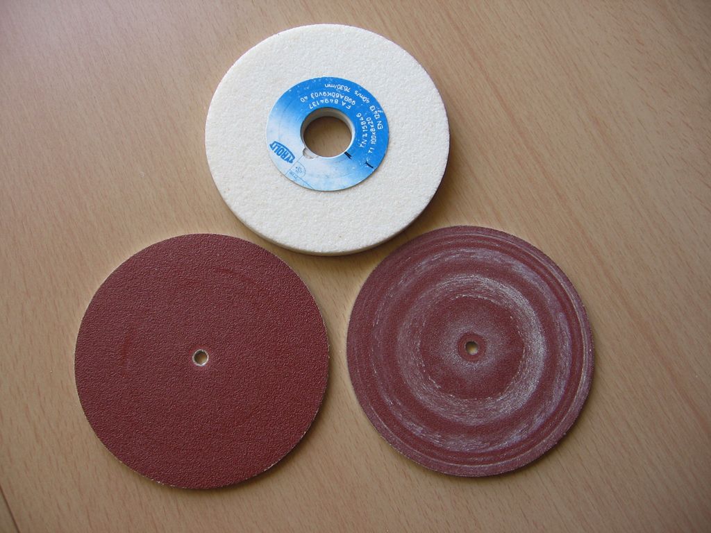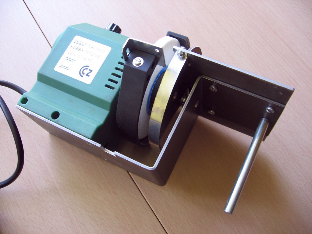 Z ocelového plechu o síle 2 mm jsem zhotovil držák ve tvaru písmene Z a přišrouboval k němu čtyřmi vruty brusku. Z druhé strany držáku je čtyřmi šrouby M4 přišroubován brusný stolek, do kterého jsem udělal otvor pro brusný kotouč. Kotouč je vyroben z 2mm duralového plechu o průměru 100 mm. Brusný papír jsem na něj přilepil Chemoprenem. Pro pohodlnější práci je vhodné si dopředu vyrobit kotoučů více, abychom se nezdržovali výměnou samotných brusných papírů různé zrnitosti. Sám jsem si vyrobil dva kotouče.