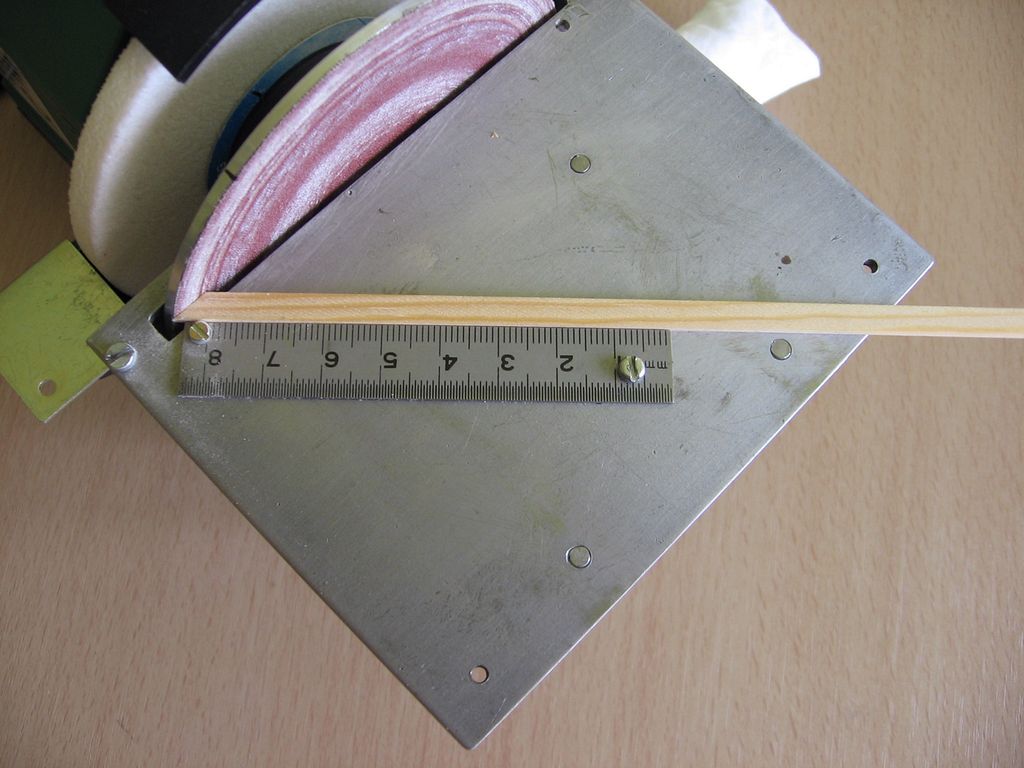 Stolek, který je vertikálně kolmý k brusnému kotouči, je pomocí dvou šroubů M3 opatřen dorazem z kusu ocelového měřítka, což je vylepšení, které jsem udělal až po otištění článku v RC revue. Pomocí měřítka mám možnost kontrolovat ubroušení materiálu. Na dorazu lze nastavit požadovaný úhel broušení. Já mohu nastavit úhel 90° nebo 45°. Po vyvrtání patřičných dírek je možno brousit i jiné úhly.