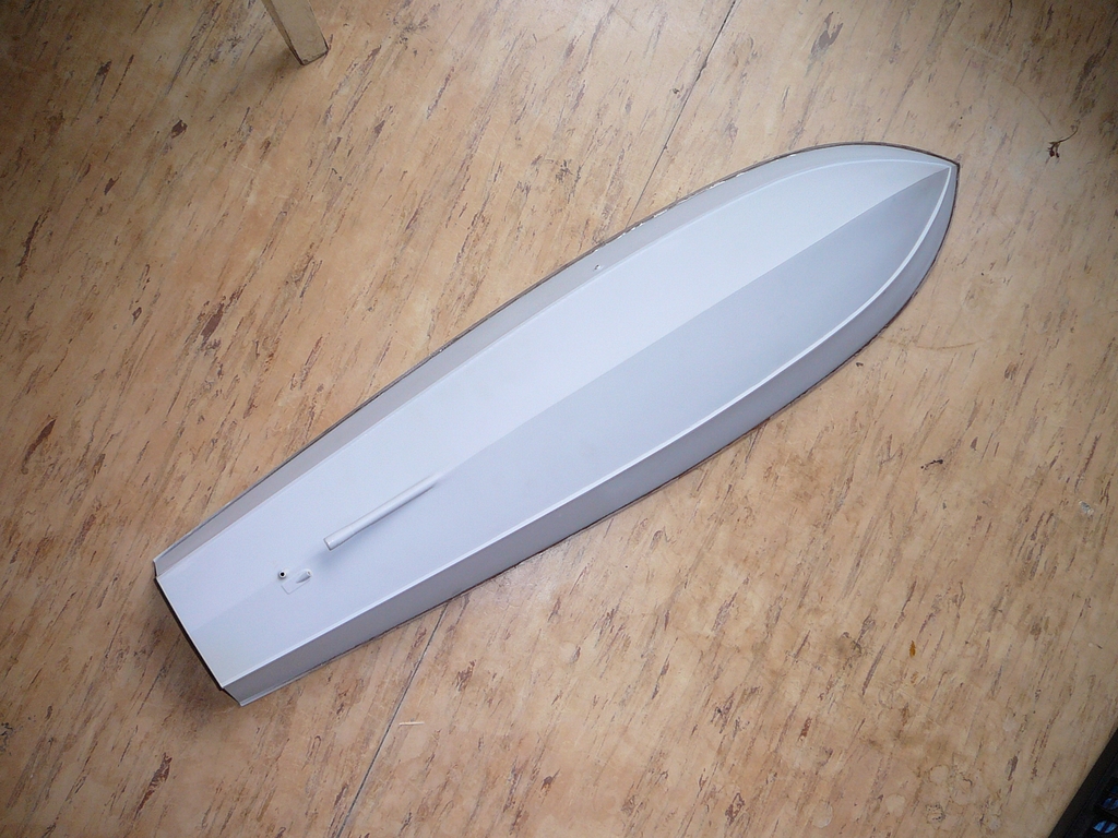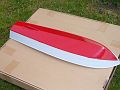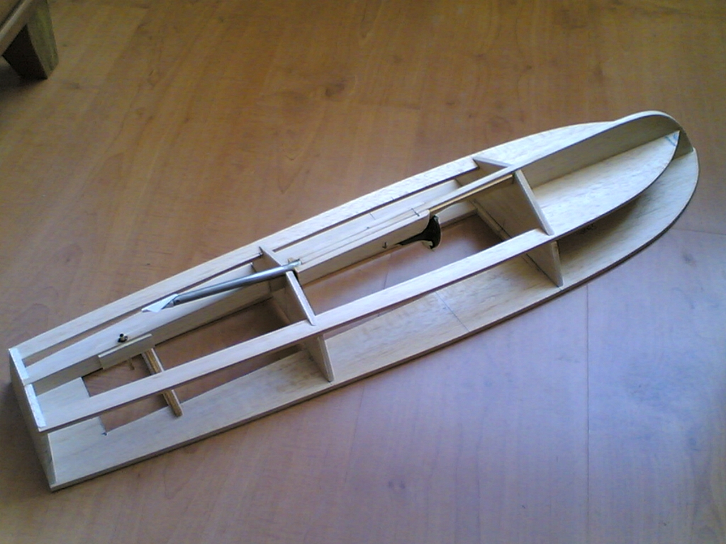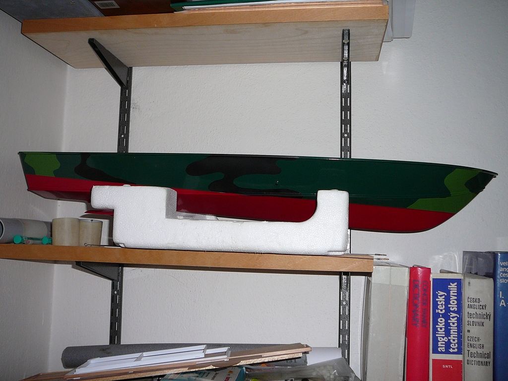 Po těchto operacích následovaly první jízdní zkoušky. Co kdyby to nejezdilo? To by nemělo cenu pokračovat ve stavbě. Na chalupě, za bezvětří jsem se vypravil k rybníku, vše zapojil, vyzkoušel, oblepil výplň otvoru na palubě lepicí páskou a položil trup na vodu. A ono to jezdilo! Měl jsem velikánskou radost, protože loďka měla zhruba takovou rychlost, jakou jsem si představoval. Svižný rozjezd, příď z vody. Jakákoliv rychlá, byť i malá výchylka kormidla v plné rychlosti způsobila velice ostrý obrat. Po chvíli jsem se vrátil ke břehu a zkontroloval vybavení. Motor (přestože má vodní chlazení), regulátor i baterky byly dost teplé. Počítal jsem s nějakým zkoušením a měl jsem připravené další velikosti šroubů, abych mohl trochu experimentovat. Vyměnil jsem tedy šroub. Místo původního 40 mm jsem nasadil šroub o průměru 30 mm. Pohon se hřál výrazně méně, ale rychlost také poklesla. Následoval šroub o průměru 35 mm. S ním jezdila lodička zhruba očekávanou rychlostí a pohonná soustava se hřála méně než se šroubem 40 mm. V pohodě jsem na obou udržel ruku. Paráda a spokojenost. Došel jsem k závěru, že pokračovat ve stavbě má smysl.