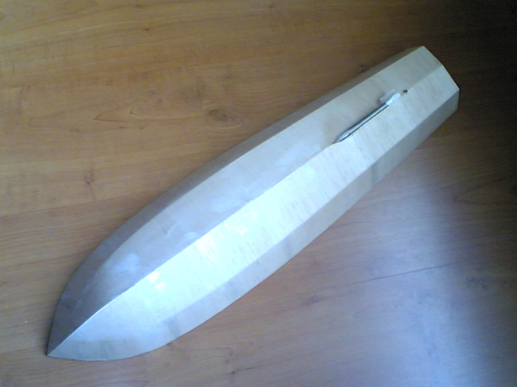 Kormidlo má hřídel z drátu o průměru cca 3 mm. U Vaňoucha ho prodávají společně s mosaznou trubičkou o vnějším průměru 4 mm. Dohromady jsou přesně spasované, takže se nevyskytují nežádoucí vůle. Drát jsem lehce nařízl a ohnul pod úhlem asi 30° (ono to bez naříznutí moc ohýbat nešlo). Potom jsem podle zahnutého drátu zhotovil zářez do prkénka 3 mm silné balzy ve tvaru kormidla a drát do něho zalepil. Po vytvrzení lepidla (epoxy) jsem vše obrousil do požadovaného tvaru a nakonec jsem kormidlo polepil z obou stran překližkou 0,6 mm. Kormidlo tím získalo na odolnosti vůči mechanickému poškození. Po vybroušení následovalo totéž, co u trupu lodi. Stříkání a broušení, dokud jsem neuznal za vhodné přestat.