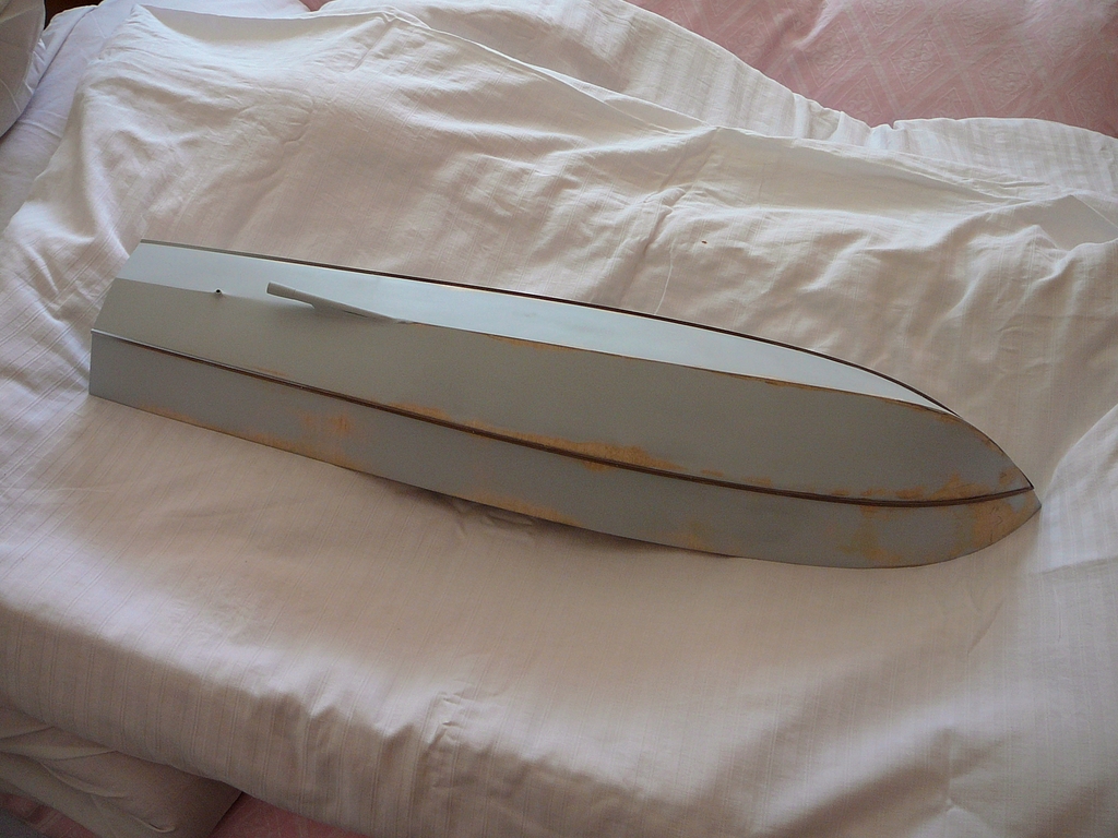 Po vybroušení a lehkém vytmelení jsem nechal trup odležet a v mezičase jsem si zajistil silný modelspan a lepící lak. Lak jsem naředil v poměru 1:1 s ředidlem a celý trup několikrát napustil. Mezi jednotlivými vrstvami laku jsem vždy lehce brousil. Pak jsem trup polepil modelspanem, celkem šesti díly: paluba, záďové zrcadlo, boky a dvě části dna, vše s dostatečným přesahem na zahnutí přes hrany. Potom opět broušení a několikeré lakování s broušením mezi vrstvami. Potom přišel na řadu základní nátěr a přebroušení (Obr. 05).