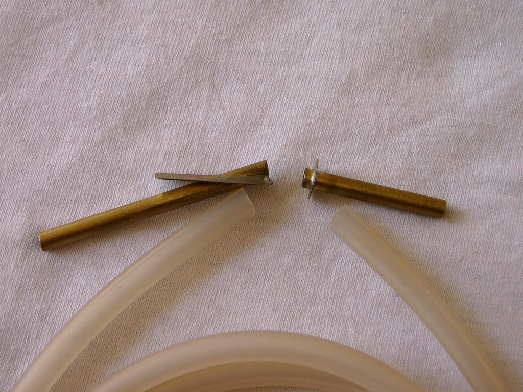 V mezičase jsem si připravil díly vstupu a výstupu chlazení motoru (Obr. 07), zdířku antény a anténu (Obr. 08). Vstup i výstup chladící vody jsou připájeny na kus mosazného plechu z kontaktů ploché baterie. Přesný důvod neznám, ale chtěl jsem mít něco kolem trubičky, co by umožnilo lépe a bezpečněji průchod trupem utěsnit. Měl jsem obavu, že spoj trubičky s obšívkou zalepený natupo nebude dostatečně pevný. Po zalepení do trupu jsem na trubičky nasadil silikonovou hadičku o průměru 4 mm. Délka je zvolena tak, aby umožňovala nasazení na chladící spirálu. Spoje jsou dostatečně těsné a drží bez jakéhokoliv dodatečného pojišťování. Vstupní trubička je uříznutá bez úkosu, ale je do dna vlepená pod hodně malým úhlem (doporučení od modelárny Vaňouch), takže voda do ní stupuje velmi snadno. Umístil jsem ji napravo mezi šroub a pouzdro kormidla (Obr. 09).