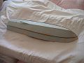 Po zaschnutí, oříznutí a zabroušení přesahů obšívky boků došlo na obšívku dna (Obr. 04). Jedinými komplikacemi byla vlepená pouzdra hřídelí a výše zmíněná nestejná kvalita použité balsy. Nově nakoupená balsa byla v pořádku, ale asi třetinu materiálu jsem měl doma a právě tahle třetina mi znesnadnila život. Dokonce i jednotlivá prkénka měla na různých místech různou tvrdost. To mi komplikovalo nejen řezání, ale tvrdší úseky se i mnohem hůře ohýbaly, což se projevilo hlavně na přídi, kde jsou dost velká zakřivení. Lepidlo, spousta špendlíků, gumových kroužků a sprostých slov ale nakonec učinily svoje a obšívka byla položená. Počkal jsem, až vše uschne, ořezal velké přesahy a zabrousil je. Konečně jsem nedržel v ruce jenom kostru, ale téměř hotový trup lodi! To jsem si tedy myslel, protože jsem ještě nevěděl, jak opatrně budu muset brousit, abych neměl trup hrbolatý. Lepené spoje šly brousit hůř kvůli vlastnostem použitého lepidla, hůře se také brousila místa tvrdé balsy, zato velice dobře ubývala balsa měkčí. Velmi důrazné poučení pro příště.