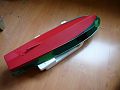 Následovalo vytvoření kamuflážního schématu, které v plánku nebylo rozkreslené. Když jsem po kratším hledání nenašel, co jsem potřeboval, nezbylo než improvizovat. Udělal jsem si šablony z tvrdého papíru, ty jsem překreslil na maskovací fólii a vystíhal. Potom přišel na řadu nástřik barev. Začal jsem dnem, protože je jednobarevné. Docela se mi to podařilo (Obr. 11). Odstín sice nebyl úplně správný, ale mně vyhovoval. Horší to bylo s trojbarevnou kamufláží. Dva odstíny zelené a černá. Znal jsem odstíny Humbrol, které použil autor plánku, ale najít je ve spreji je strašná dřina. Pokusil jsem se najít převod mezi vzorkovnicemi Humbrol a RAL, ale ekvivalenty jsem nenašel. Tak jsem vybral něco, o čem jsem si myslel, že by to mohlo fungovat a koupil dvě zelené (RAL 6005 a 6010) a černou (RAL 9005). Nejprve jsem nastříkal bez šablon světle zelenou RAL 6010. Tu jsem pak zamaskoval a nastříkal tmavě zelenou RAL 6005. Po zaschnutí jsem obě zelené zamaskoval a nastříkal jsem černou RAL 9005. Podle mého soudu se mi to docela povedlo (Obr. 12 a (Obr. 13). Palubu jsem zatím nechával být. Chtěl jsem ji nastříkat, až bude hotová nástavba a vybavení paluby.