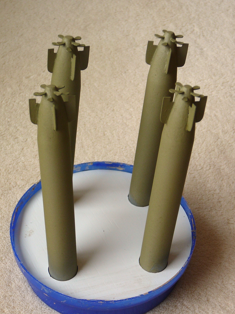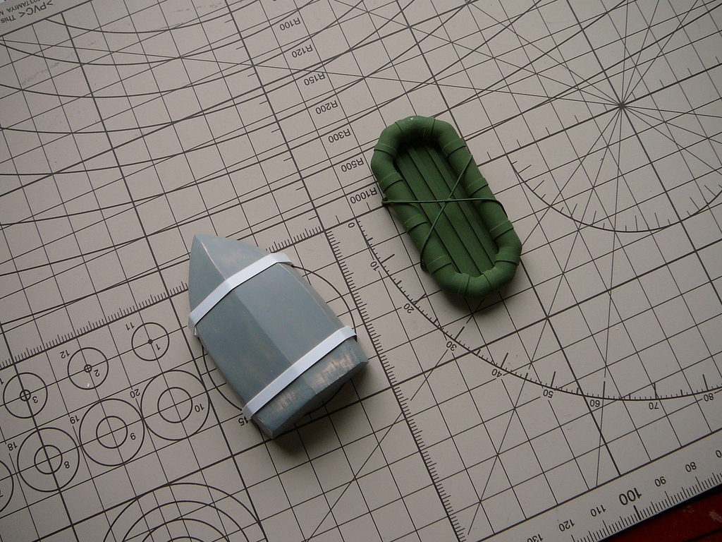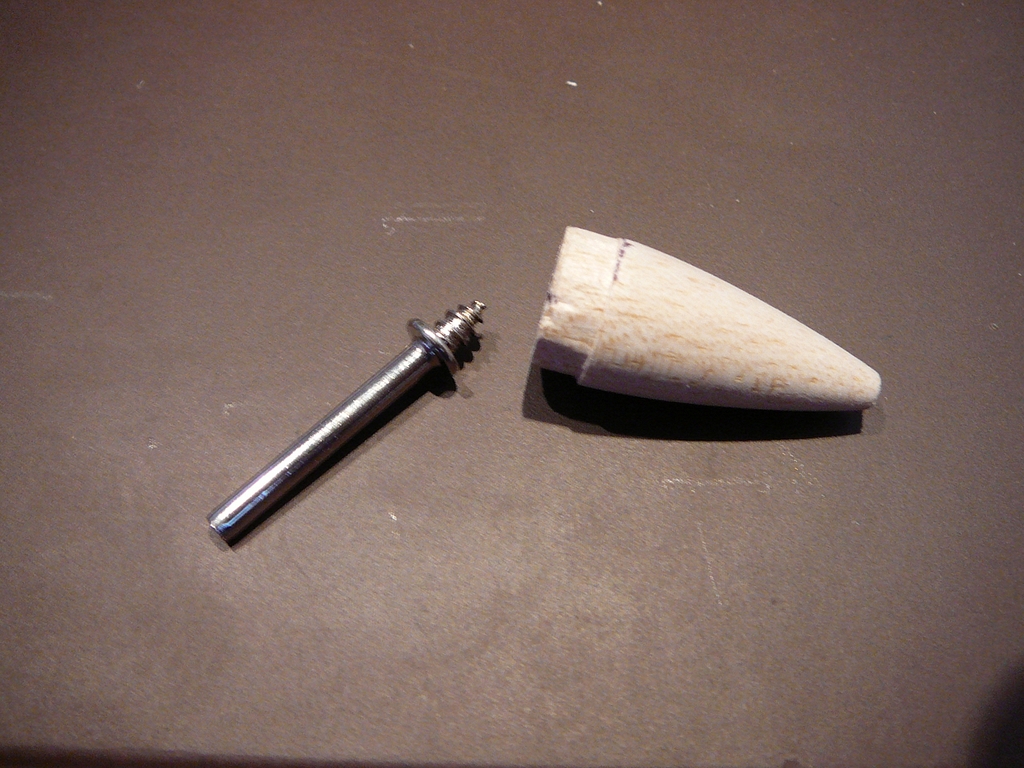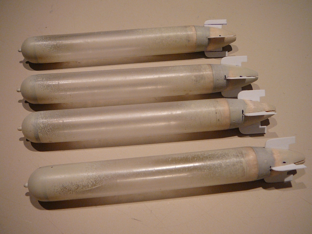 Za samostatnou zmínku stojí asi torpéda. Moji kluci totiž jednou přivlekli od kamaráda zkumavku. To by nebylo nic mimořádného, zkumavek jsem za svůj život pár viděl, ale tahle byla plastová. Po krátkém vyjednávání mi umožnili vyzkoušet „slepitelnost“. a hned napoprvé jsem se strefil: lepidlo na plastikové modely fungovalo skvěle a kousek PSH na zkumavce perfektně držel. Zabrouzdal jsem na internetu a zjistil, že zkumavky z PSH jsou běžně k dostání a navíc ve vyhovujících rozměrech (průměr 16nbsp;mm). Dokonce i délka vyhovovala mým potřebám. Při cestě k zubaři jsem proto navštívil nedalekou prodejnu s laboratorními potřebami (hned vedle prodejny PAN-AIR) a potřebné 4 kusy zakoupil. Při ceně cca 3,- Kč za kus to snad ani nešlo jinak. S koncovými kónusy torpéd už byla situace horší, protože nepatřím mezi šťastné majitele soustruhu. Nakonec vše vcelku uspokojivě vyřešil kousek balsy a upínací trn na filcové leštící kotoučky upnutý do vrtačky (Obr. 46).