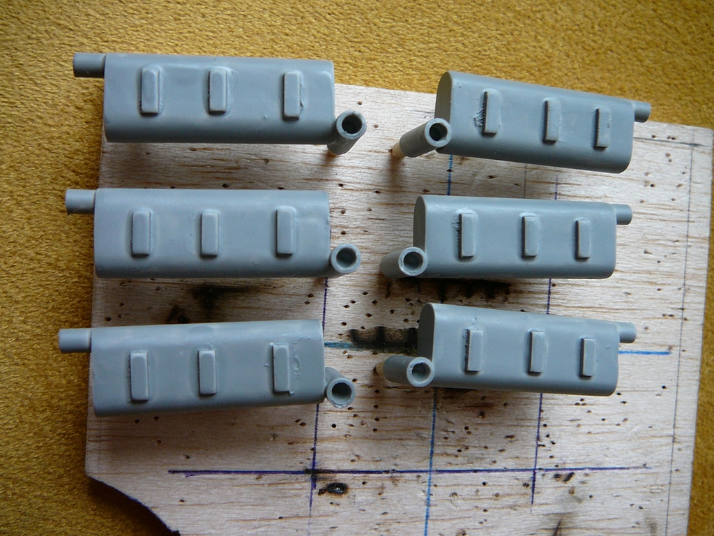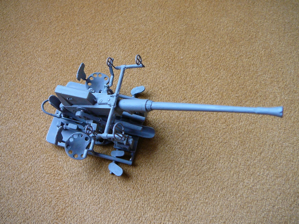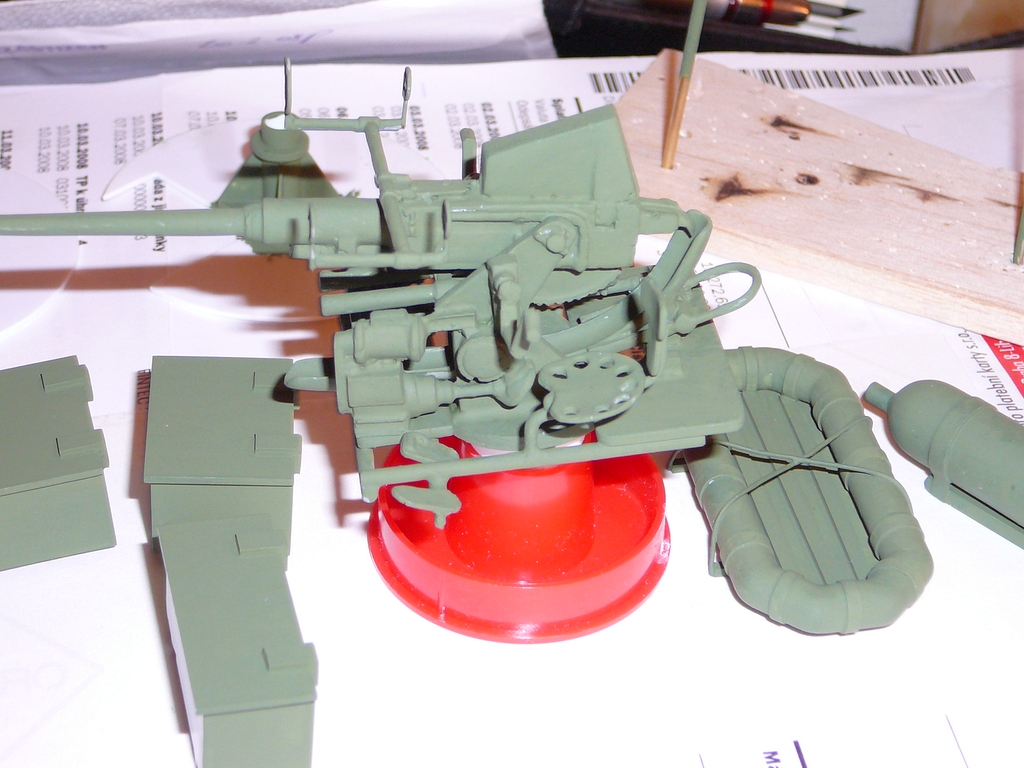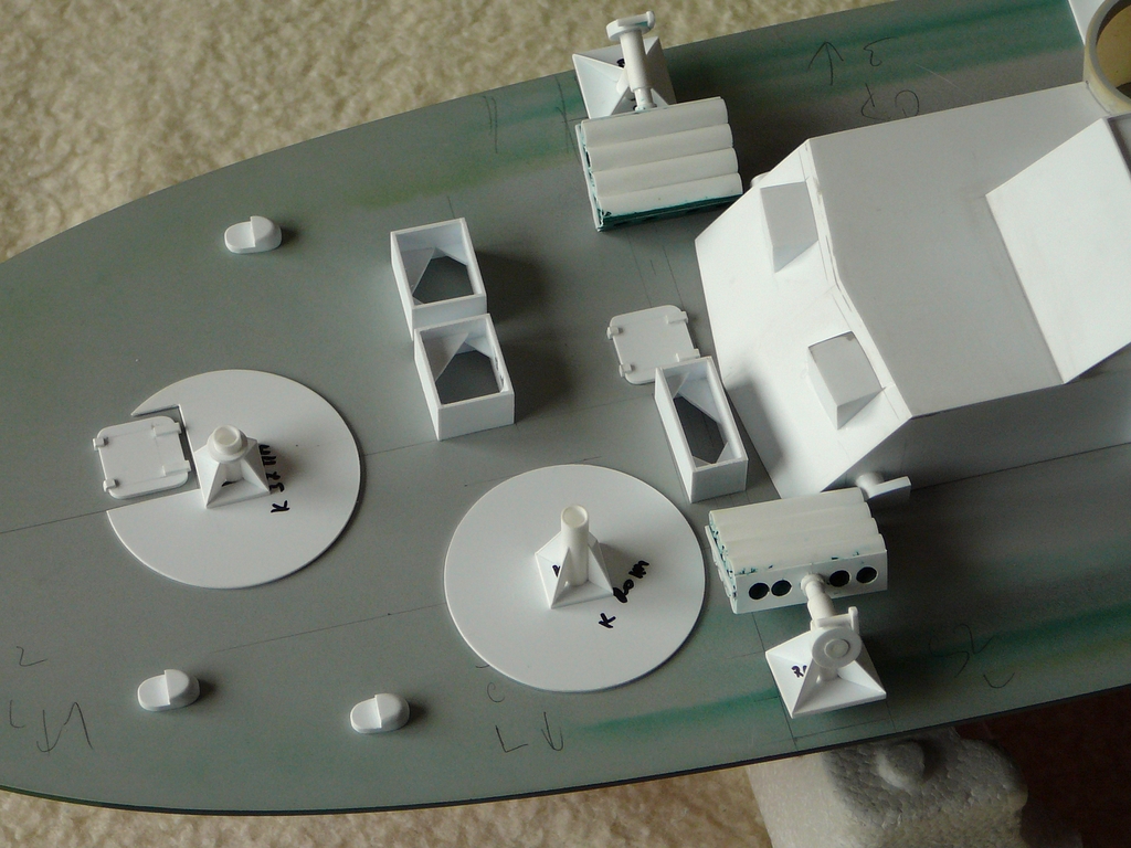 Dále přišly na řadu podstavce příďových kanónů, raketomety, bedny na munici, držáky torpéd, poklopy a ventilátory (Obr. 26 a Obr. 27). V průběhu času jsem postupně vyráběl další doplňky. Kanón 20 mm (Obr. 28, Obr. 29, Obr. 30, Obr. 31, Obr. 32 a Obr. 33), 37nbsp;mm kanón (Obr. 34, Obr. 35, Obr. 36, Obr. 37, Obr. 38, Obr. 39, Obr. 40 a Obr. 41), 40nbsp;mm Bofors (Obr. 42 anbsp;Obr. 43) z pirátských odlitků, kulomety Browning (Obr. 44) ze stavebnice AIRES a torpéda (Obr. 45, Obr. 46, Obr. 47, Obr. 48, Obr. 49, Obr. 50, Obr. 51, Obr. 52, Obr. 53, Obr. 54 a Obr. 55). Kromě stavebnic dvou zbraní je vše výroba „samo-domo“, nebo – abychom byli světoví - „scratch-build“. Materiál je tedy různý: dřevěné lišty, mosazné trubičky, měděný drát, profily a desky PSH.