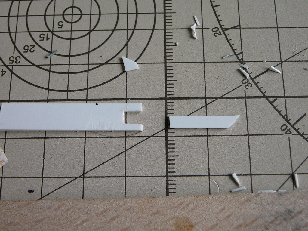 Průběžně, po celou dobu stavby trupu a nástavby, jsem stavěl doplňky. Víceméně bez systému, na co byla chuť a co se dalo. Většinou výzbroj a výstroj nástavby a paluby, podle času. Tyto drobnosti se totiž dají dělat i po malých krůčcích v kuchyni na stole, což je moje pracoviště/dílna. Nic většího tam dělat nelze, protože musím co chvíli vše balit, abych uvolnil místo pro „důležitější činnosti“. Jakékoliv špinavější činnosti musí buďto na balkon nebo na chalupu. Přišel tak na řadu stožárek a omezovací oblouk 40nbsp;mm kanónu (Obr. 21), omezovací konstrukce kulometných věží (Obr. 22), záchranné vybavení (Obr. 23), tlumiče výfuků (Obr. 24) - bohužel, makro vidí i to, co moje oko už nevnímá -, a různé antény (Obr. 25). Antény a omezovače jsou z mosazného drátu různých průměrů, zohýbané do požadovaného tvaru a spájené cínem. Tlumiče jsou vlastně dvě trubičky PSH (profily Evergreen) slepené k sobě, ovinuté páskem tenkého (0,5nbsp;mm) PSH. Po zhotovení úkosu jsou konce „zavíčkované“ kouskem PSH a víčka vybroušená do tvaru. Ostatní doplňky jsou postupně nalepené.