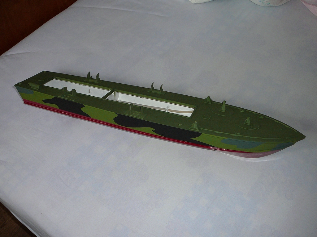 Po dokončení části zbraňových systémů jsem se rozhodl natřít nástavbu. Po důkladném zvážení, jestli zvládnu uspokojivě zamaskovat a sprejem nastříkat její relativně komplikovaný tvar, jsem došel k závěru, že radši budu „štětcovat“. Ale čím? Stříkat si barvu ze spreje do kelímku a natírat ji štětcem jsem s ohledem na vlastnosti barev radši zavrhnul. Nezbývalo, než sáhnou jinam. Dobrou osobní zkušenost mám s barvami Humbrol, které použil i autor plánku a tak bylo rozhodnuto. Sice to představovalo nutnost přestříkat celý trup znovu, ale nakonec jsem se s tím smířil. Dalším podpůrným argumentem bylo, že jsem v mezičase sehnal přesné kamuflážní schéma. Nástavbu, záď s tlumiči a všechnu výstroj jsem natřel štětcem barvami Humbrol (Obr. 56 a Obr. 57). Když byla nástavba hotová, přestříkal jsem ji při nejbližší příležitosti polomatným lakem, aby se barvy „neosahaly“. V létě na chalupě jsem celý trup nastříkal znovu (samozřejmě jsem předtím vše přebrousil), tentokrát správnými odstíny barev a ve správném kamuflážním schématu (Obr. 58, Obr. 59 a Obr. 60). Zároveň jsem zkorigoval polohu vodorysky, která mi v původním provedení trochu „ujela“. Po několikadenním schnutí jsem vše nastříkal polomatným lakem pro zlepšení odolnosti nátěru.