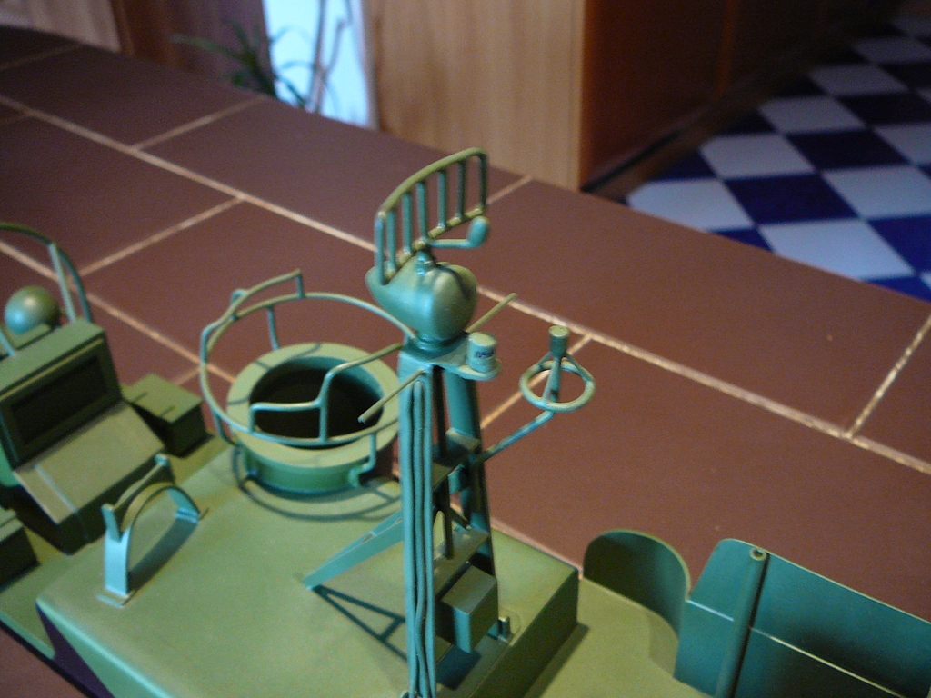 Nadešel čas dalších drobností, jako například vybavení kormidelny (Obr. 61) a dokonce jsem se rozhodl pro doplnění funkčních pozičních světel (Obr. 62, Obr. 63, Obr. 64 a Obr. 75) (omlouvám se, poslední obrázek nic moc). Ta jsem zhotovil z LED o průměru 3nbsp;mm, které jsem zalepil do trubičky PSH odvrtané tak, aby do ní šla LED těsně zasunout. Před vlepením LED jsem v trubičce vyřízl a vypiloval otvor, který by měl sloužit jako vymezovač sektoru svícení. Horní konec LED jsem zabrousil naplocho a trubičku jsem odshora zatmelil. Rozvody jsem vedl vnitřkem nástavby, jen od bílého stožárového světla jsou kablíky vedeny po stožárku. Použil jsem jednotlivé žíly servo kabelů. Napájení beru z BEC přijímače.