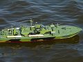 Po přípravě na jízdu jsem loď položil na hladinu a první dojem byl dobrý! I přes to, že díky změnám ve "strojovně" vyšla hmotnost o cca 400 gramů vyšší vůči originálu, loď perfektně seděla na vodorysce, bez náklonu, zkrátka paráda (Obr. 70). Ještě jednou jsem si ověřil, že kormidlo funguje a postupně jsem začal přidávat plyn. PT se rozjelo po zrcadlově klidné hladině rybníka. Nejdříve jsem vyzkoušel zatáčení při pomalé jízdě. Reakce na kormidlo byly dost živé, lodička velmi svižně měnila směr jízdy. Potom jsem zvyšoval rychlost až na maximální. Dojem z jízdy na plný plyn byl velmi realistický (Obr. 71). Dokonce i syn, který mi sekundoval se Sharkem, prohlásil (sám od sebe, aniž bych se ptal), že ta jeho loďka sice jede rychleji, ale ta moje že vypadá hodně opravdově. Samozřejmě, že se mi hruď nadmula pýchou a radostí. „Umělecký dojem“ byl skutečně dobrý, přímo oku lahodící. Dokonce jsem na chvilku zauvažoval o doplnění figurek námořníků. Příď nad hladinou, zhruba od poloviny délky trupu odstřikovala vodní tříšť. Když jsem si prošel fotografie skutečných PT-Boats (Obr. 72), bylo to hodně blízké skutečné předloze.