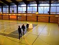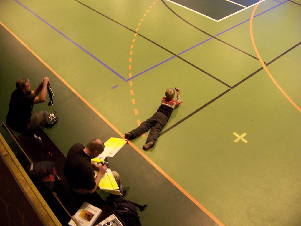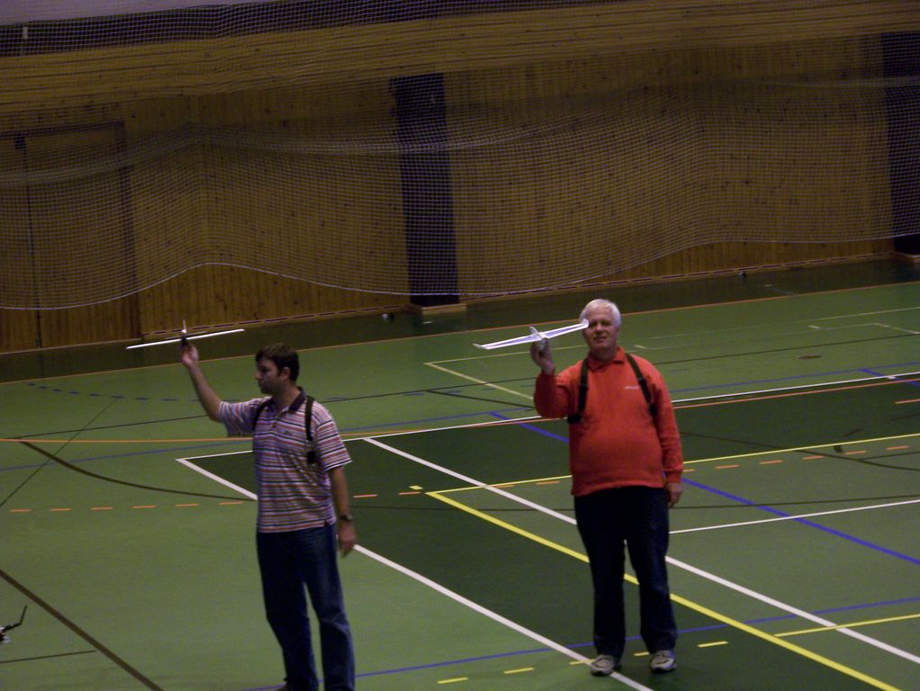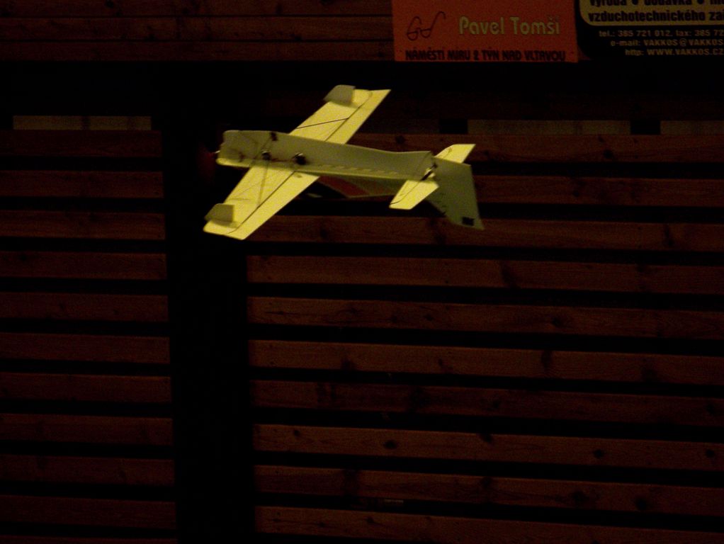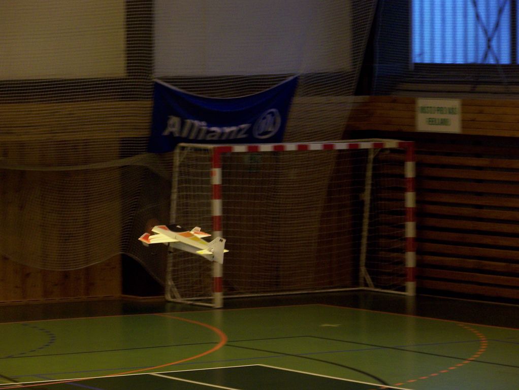 V hale bylo teplo a značně živo. Však jsem dorazil až v půl jedné, když pomalu končily lety akrobatů a schylovalo se k závodu kolem pylonů. Hned se chci znalcům omluvit, že do těch halových kategorií příliš nevidím, takže odbornější články naleznete v modelářském tisku. Rychlostní závod kolem dvou pylonů probíhal zhruba tak, že tři borci házeli na povel s odstupem sekundy letadla svých tří kolegů. Létalo se, tuším, na deset kol a o pády a srážky nebyla nouze. Ale narozdíl od pylonových speciálů se spalovacím motorem tyto malé elektrolety způsobí daleko menší škodu. Vzhledem k jejich velké rychlosti nepřináším žádnou fotografii, ale něco málo je snad patrné z videa.