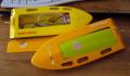 Po nějaké době jsem zakoupil trupy MiniSonicEvo od firmy Hopf SRN. Tyto trupy mají druhé nejčetnější zastoupení na soutěžích . Problém těchto trupů je v tom, že výrobce dodával trupy pouze jako laminátovou skořepinu bez jakýchkoliv rozměrů pro zástavbu hřídele, kormidla… Díky internetu jsem tyto informace získal na Hydroworld.de, kde jsem našel i výkres boční stěny tzv. flutkanalu ( komory), která po zaplavení umožní zpětné převrácení modelu. U tohoto modelu je to ale také podmíněno umístěním vybavení na levou stranu. Nějakou dobu jsem to řešil nalepením olověných závaží. Protože trup je vlastně tenká placka, při vlastním provozu jsem měl velké problémy při výměnách motoru. Nakonec jsem použil řešení, které jsme dříve používali u rychlostních modelů třídy F1+kg. Motor povoluji s celým ložem shora, v další verzi je duralové lože nahrazeno laminátovým (pro snížení váhy modelu).