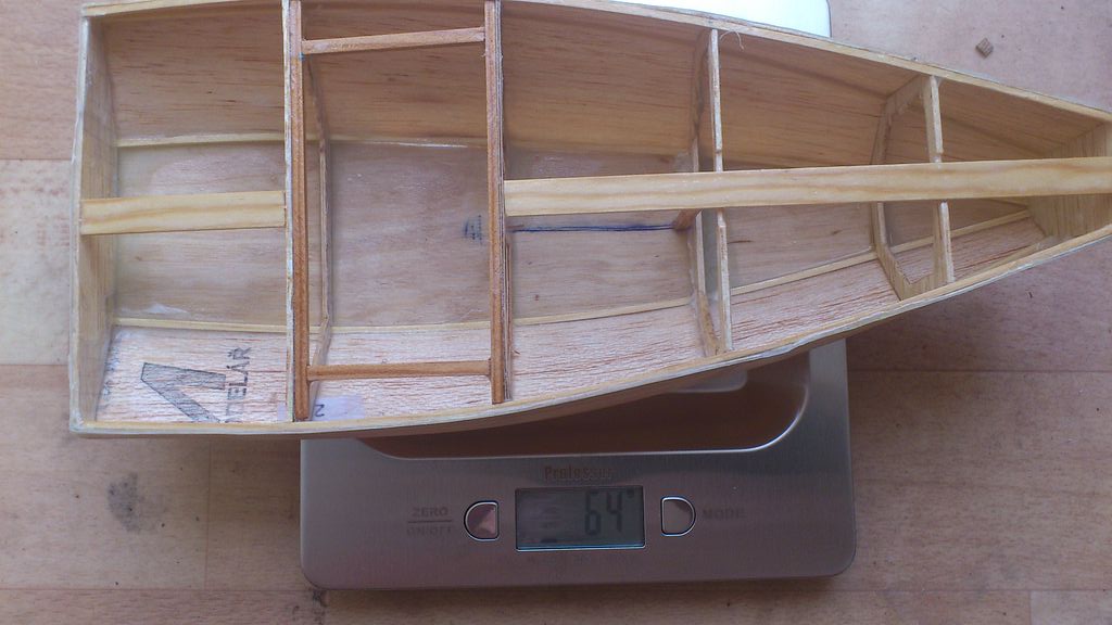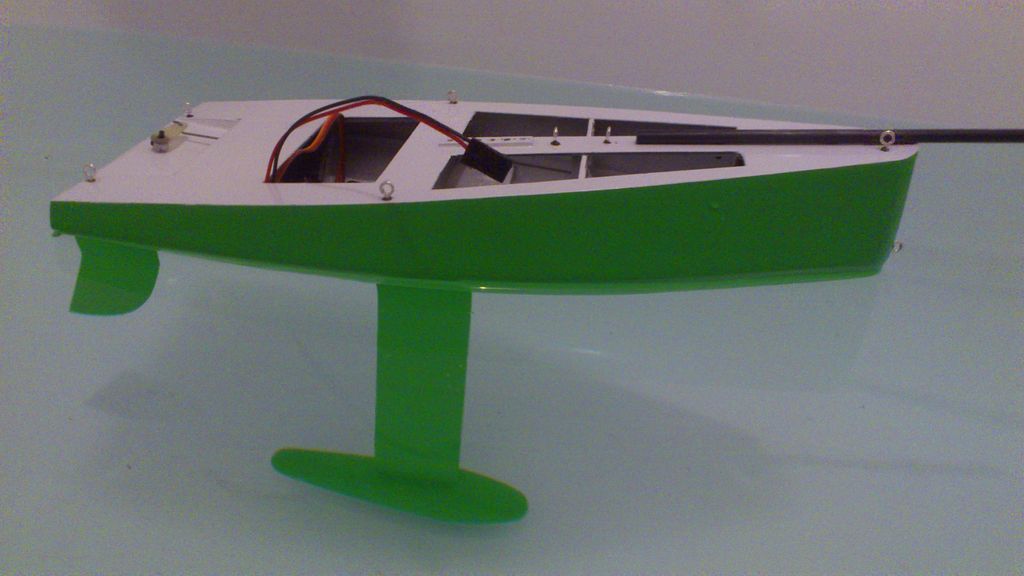 Kýl a kormidlo jsou vyrobeny z laminátových desek 0,4 mm a uhlíkových trubiček a tyček. Víc napoví obrázek. Destičky jsem zdrsnil a „nabodoval“ vteřinkou uhlík. Když vše zaschlo, tak jsem spoje přelil Letoxitem stříkačkou s jehlou. Vznikl tak pevný a lehký kýl s kormidlem. Paluba je ze stejného materiálu. Pro odlehčení a snadnější motání špagátků je na přídi vyňamaná. Po instalaci jsem díry zalepil Orastickem. Lepeno také epoxidem.