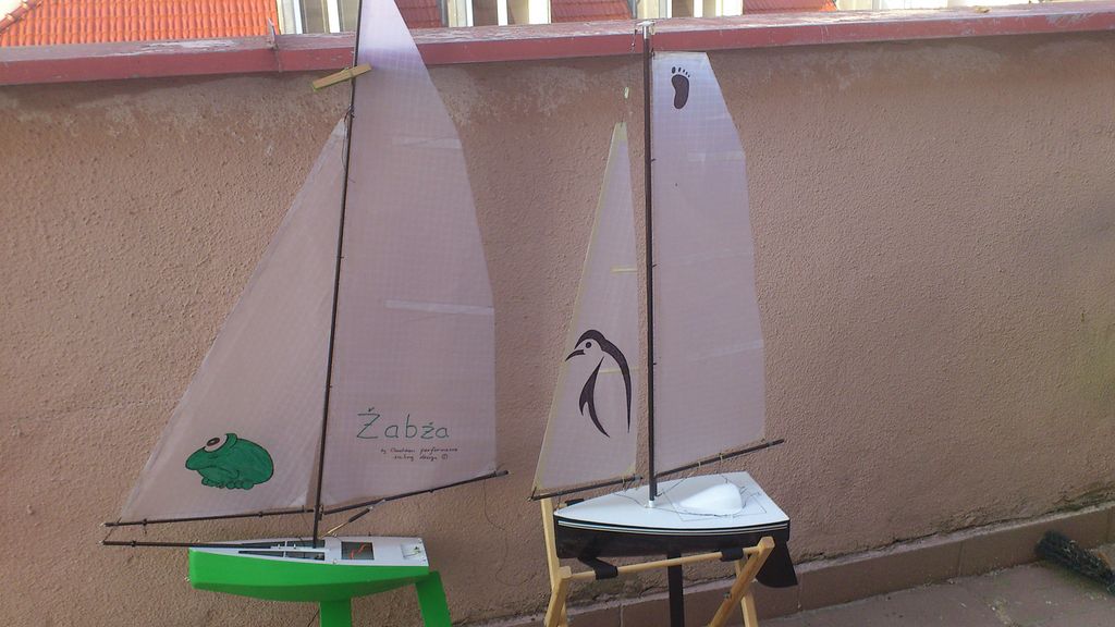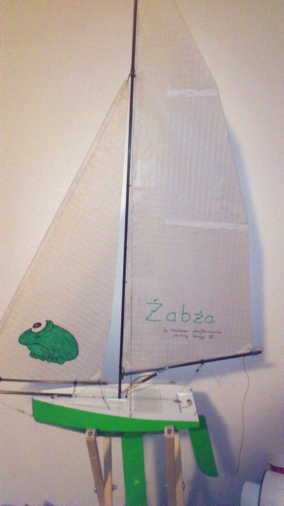 Listováním internetu jsem zabrousil na stránky, kde mě jednoduchostí a příjemnými plavebními vlastnostmi učarovala 50 cm dlouhá plachetnička Jauginette. Jak samo jméno napovídá, pochází z Francie, země vína, sýrů a dobrého jídla - žab nevyjímaje. Když jsem kontroloval zásobu barev, kde byla ještě nepoužitá zelená, zrodilo se jméno zároveň s první čarou na pracovní desce, jméno Žabža.