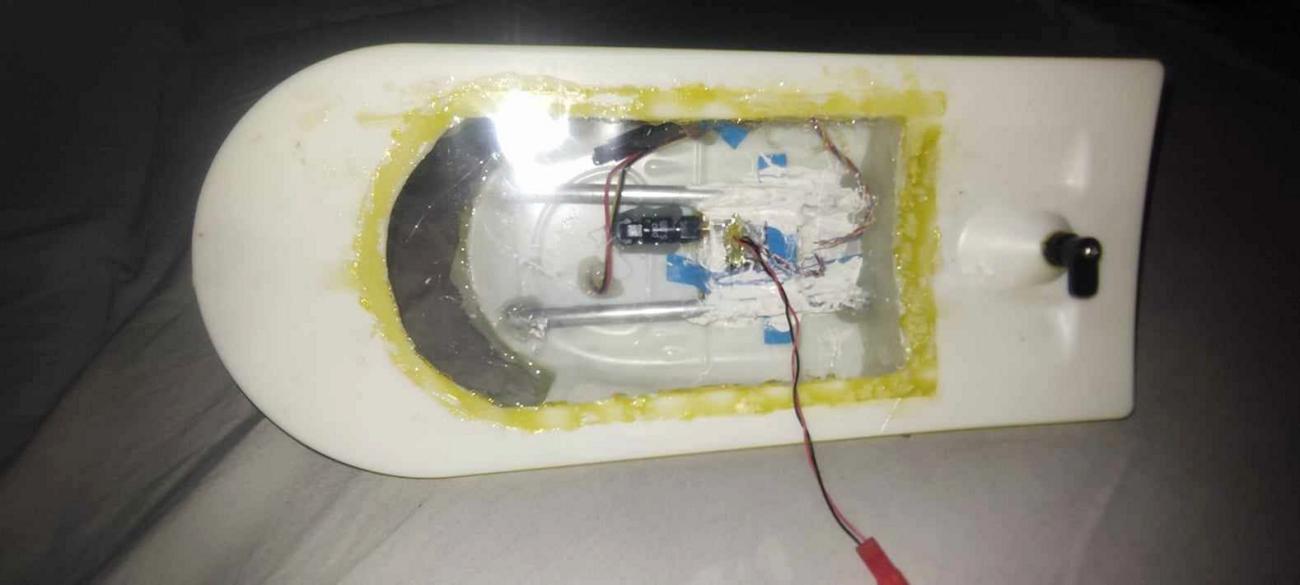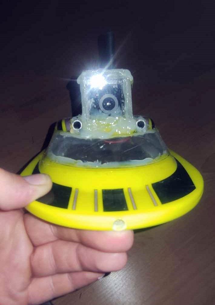 Ty vedou těsně kolem video vysílače a jsou potřené také tepelně vodivou pastou. Zde mi vznikl menší neplánovaný problém. Po zasunutí trubiček, (které jsem zasunul za vyložení menší síly) se mi kabina trošku vzpružila a kamera tudíž nemohla být na místě předního skla, protože by měla špatný sklon úhlu záběru. Tudíž jsem otvor předního skla mohl zadělat. Pro tuto akci mě napadlo využít laminovací fólii. Vypadá to zajímavě když vidíte ještě prosvítat modré světlo z video vysílače. Nicméně jediná možnost kam dát tedy kameru bylo na střechu lodi. Na kryt kamery jsem použil plexisklo. Změřil jsem kameru, naměřil obdélníčky. Kameru jsem přilepil tavnou pistolí a těsně za kameru vyvrtal ještě otvor pro kablíky. Nyní jsem začal přilepovat tavnou pistolí dílky plexiskla tak, že jsem první přiložil těsně na objektiv kamery, abych co nejvíce zamezil nežádoucím odrazům a odleskům. Uvnitř kabiny jsem vše zapojil a opět jsem využil laminovací fólie, do které jsem si udělal otvor pro kabel napájení a zase fólii řádně přilepil na spodní část kabiny. Vzniklé otvory jsem ještě dolepil lepidlem a pro jistotu ještě dozalepoval tavnou pistolí. Nyní je celý systém dokonale uzavřen. Napájení FPV zajišťuje baterie Li-Pol 2S 850 mA a lze napojit i na balanční konektor baterie, která pohání samotnou loď. Samotný obraz není úplně ostrý díky analogovému přenosu a jízda poté je už spíše záležitosti rekreační pomalé plavby.