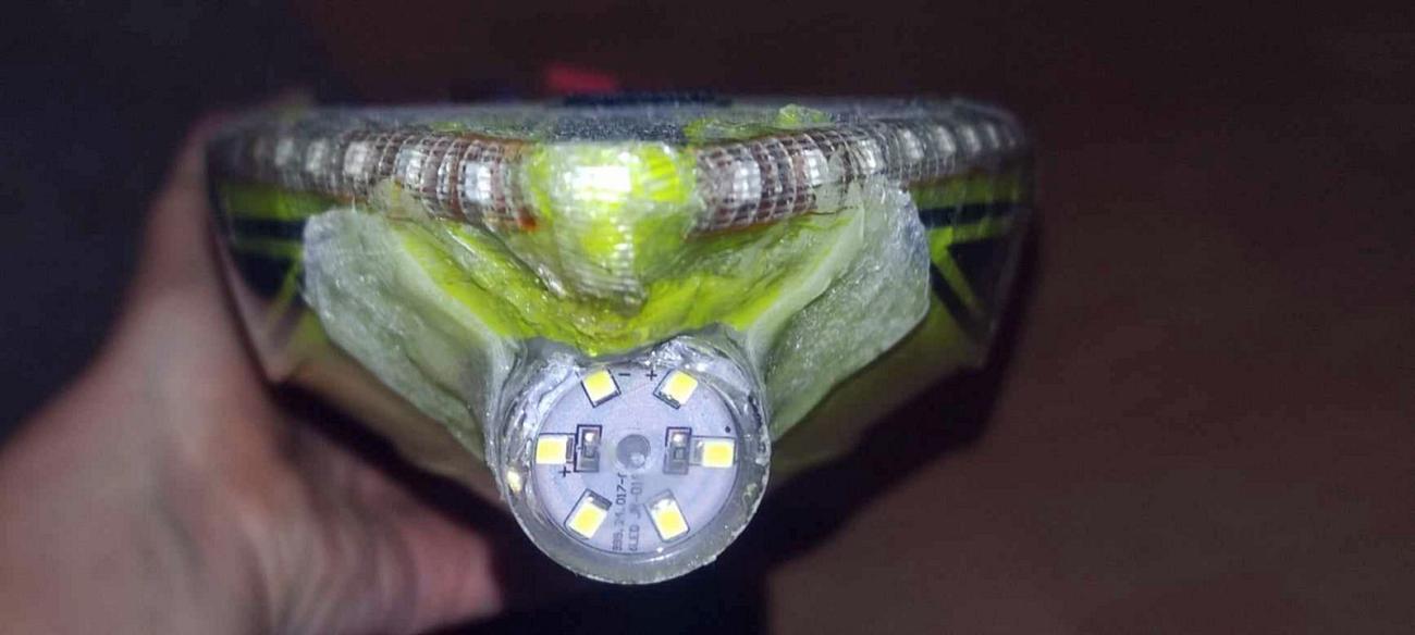 Takto je regulátor brán jako běžné servo. Což bylo potřeba, protože napájecí proud LED pásků byl příliš vysoký, než aby jej napájel samotný přijímač. Přidaný regulátor je tedy napájen Li-Pol baterií 3S 1300 mAh. Na závěr jsem udělal přední osvětlení lodě, které nebylo původně v plánu. Dětem se podařilo doma zničit lampičku na tužkové baterie, a tak proč nevyužít tento panel s 6 diodami. Do přídi lodi jsem vyřízl otvor pro vstup oválné plastové lampičky o průměru 2,5 cm. Sem se diodový panel úplně přesně vešel. Panel jsem přilepil tavnou pistolí a kabely prodloužil opět drátky od serv. Na jejich konci jsem ponechal vypínač. Toto osvětlení tedy není řízeno na dálku. A připojení je klasicky přes piny do přijímače. Lampičku s diodovým panelem jsem si podlepil tavnou pistolí, ve správném úhlu a vzniklý otvor za laminoval.