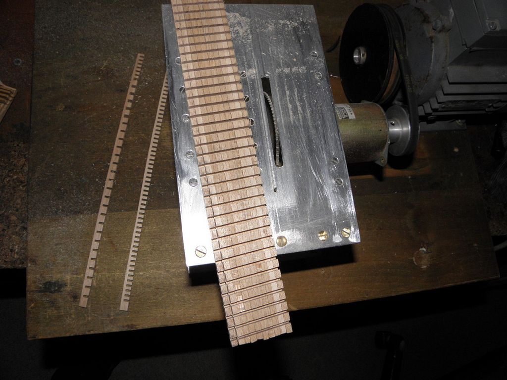 Ozubený řemínek po nadrážkování prkénka „po letech“ rychle vzal za své, když jsem se pokusil řezat prkénko napříč. Kromě toho se prkénko začalo štípat. Autor to asi myslel na balzu, a ne na to, co jsem chtěl já. Zkusil jsem měkčí dřevo, ale to bylo ještě horší, štípalo se to a zakusovalo. Koupil jsem tedy lišty z nějakého tvrdšího dřeva v železářství v Novém Boru (asi buk), aby se to neštípalo.