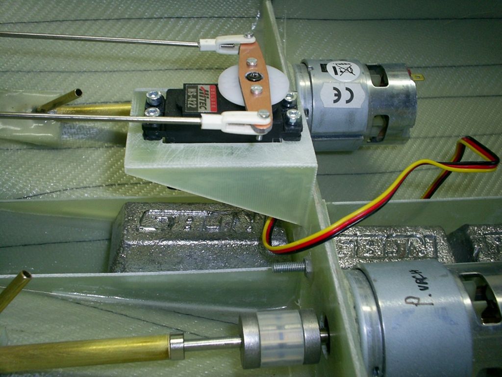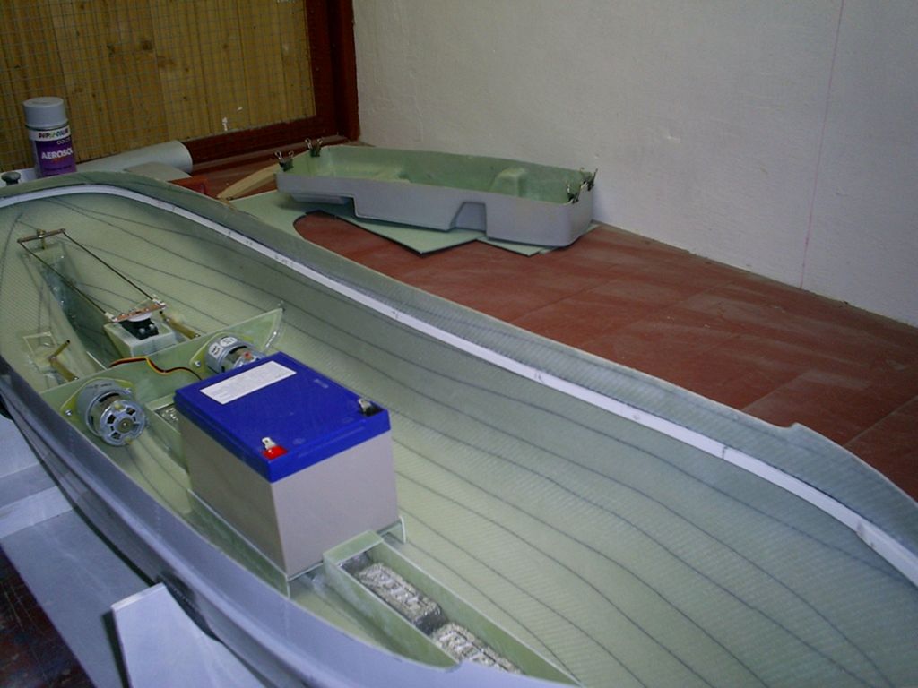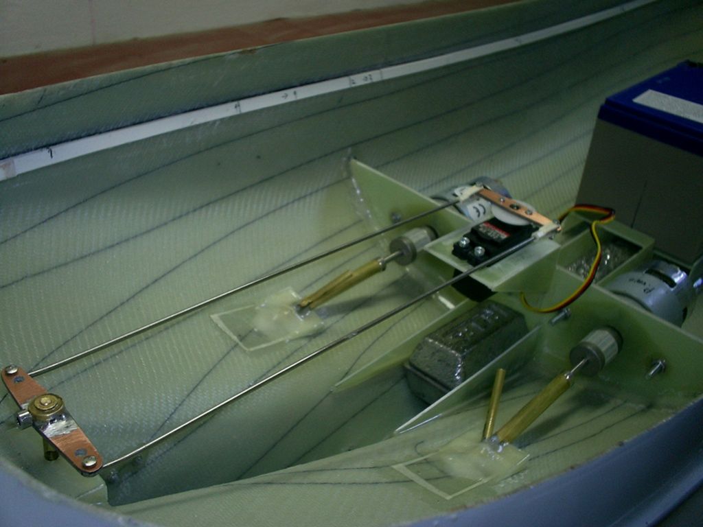 V současné fázi stavby modelu se po usazení pohonů a ovládání kormidla pracuje na trupových žebrech pro umístění baterie a zátěže, lícování prošlupu paluby, manipulačních otvorů a přesné dosazení nástaveb.