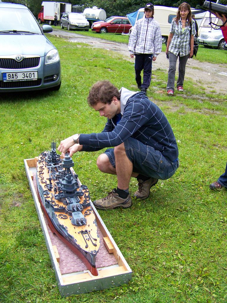 Na místo jsme přijeli kolem půl desáté, a byl to akorát čas, kdy na vodu šly parníky. Přiznám se, že jsem se těšil, protože parníky jsou moje srdcovka. Jaké však bylo moje zklamání, když jsem viděl, že na závodu se zúčastňují pouze tři modely. Útěchou mi bylo, že dva modely kormidlovali pan a paní Voráčkovi. Na jejich modely je pokaždé radost pohledět a musím uznat, že navzdory větru si vedly velmi dobře (tady si trošku šplhnu - paní Voráčková byla stejně lepší). Zatímco pára se předváděla na vodě, na břehu se začaly chystat bitevní lodě. Překvapivě byly také tři. Jestli se domluvili či co, mi není známo. Nutno říci, že tyto byly divácky vděčnější. Ne že by jejich jízdy byly natolik bravurní, či snad předváděly pyrotechnické efekty, to ne. Upoutaly spíše pobíhajícími kapitány po břehu, kteří se marně pokoušeli dostrkat radiové vlny anténou až k lodi. Holt spěch se nevyplácí a tady to platilo dvojnásob, stačí opomenout správně zapojit anténu, či ji nevytáhnout z vnitřku trupu a je na problém zaděláno. Ale i ony nakonec svou soutěž odjezdily.