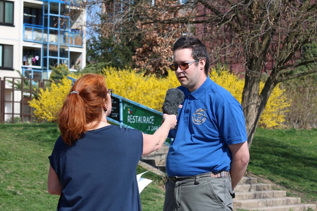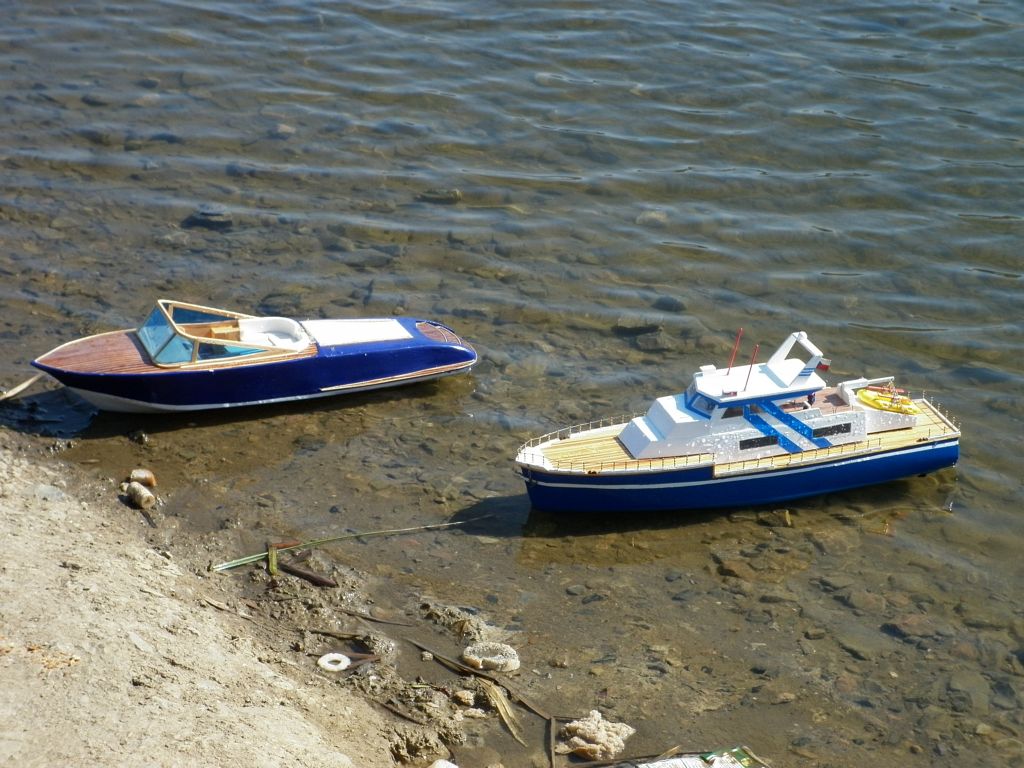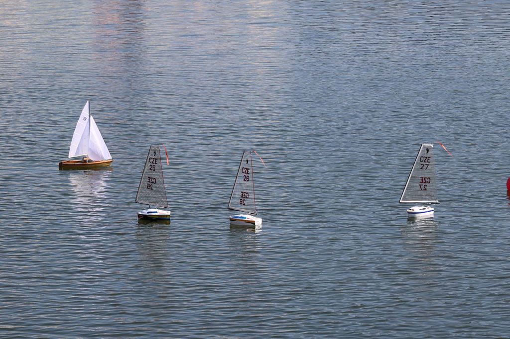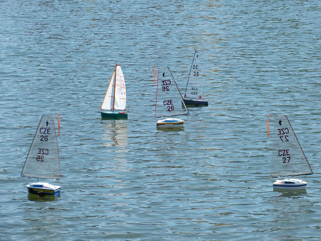 Nicméně soutěžní odpoledne začalo kategorií Footy, kdy se k mé maličkosti připojilo dalších 6 modelářů. Krátce po odstartování mi na rameno zaklepala reportérka regionální televize s dotazem, zda se mnou může natočit rozhovor. Může, ovšem musí deset minut počkat. Snad ve stresu z blížícího se mediálního výstupu jsem mezi jednotlivými jízdami ve snaze nezdržovat štáb zanedbal kontrolu vody v podpalubí, až se Footyna ve 2/3 třetí jízdy změnila v jednorázovou ponorku a nikdo ji nespatřil více. Nestihl jsem ani vytáhnout fotoaparát, natož vyslat zjara pořízený nafukovací svážecí člun![]()