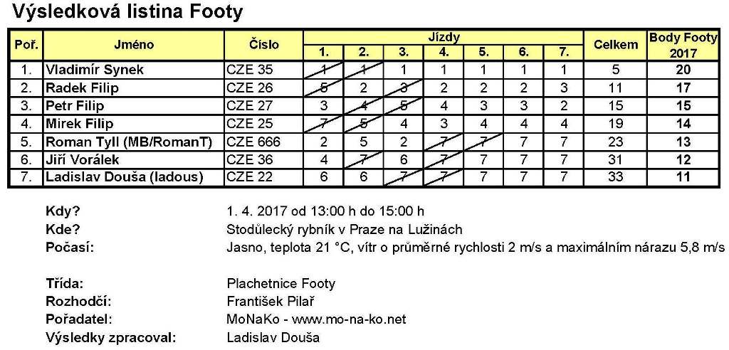 V sobotu 1. dubna 2017 jsme navázali na tradici a svolali ke Stodůleckému rybníku v Praze na Lužinách lodní modeláře, aby letos poprvé předvedli své modely. Jelikož jsme před rokem vypsali soutěžní seriál pro plachetnice třídy Footy, nemohl chybět ani tentokrát. Aby toho nebylo málo, vůbec poprvé došlo i na soutěž plachetnic RG-65.
