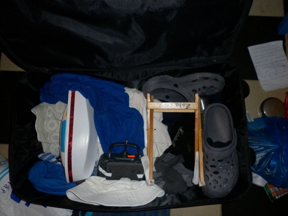 Trup jsem všelijak obložil prádlem a ručníkem. Speciální úpravou prošel vysílač: přes kniply navléknutý kus desky polystyrenu zajištěný samolepicí páskou je stačil ochránit před vylomením. Akumulátory jsem ponechal ve vysílači, ale vypínač pro jistotu přelepil samolepicí páskou proti zapnutí. Akumulátor v lodi jsem ponechal a odpojil konektorem od instalace. Náhradní aku a drobné nářadí skončilo v plážových botkách a různě roztroušené mezi věcmi, částečně v igelitce. Všechno pokud možno obložené oblečením, aby to přežilo manipulaci na letišti. Lepidla jsem zabalil zvlášť do sáčku, a pro jistotu ještě neotevřená, aby při nižším atm. tlaku v nákladovém prostoru eroplánu nezpustošila obsah kufru. Co jsem vláčel sebou, pro každý případ i na složitější opravy, ukazuje fotka na podlaze ostrovního sídla: