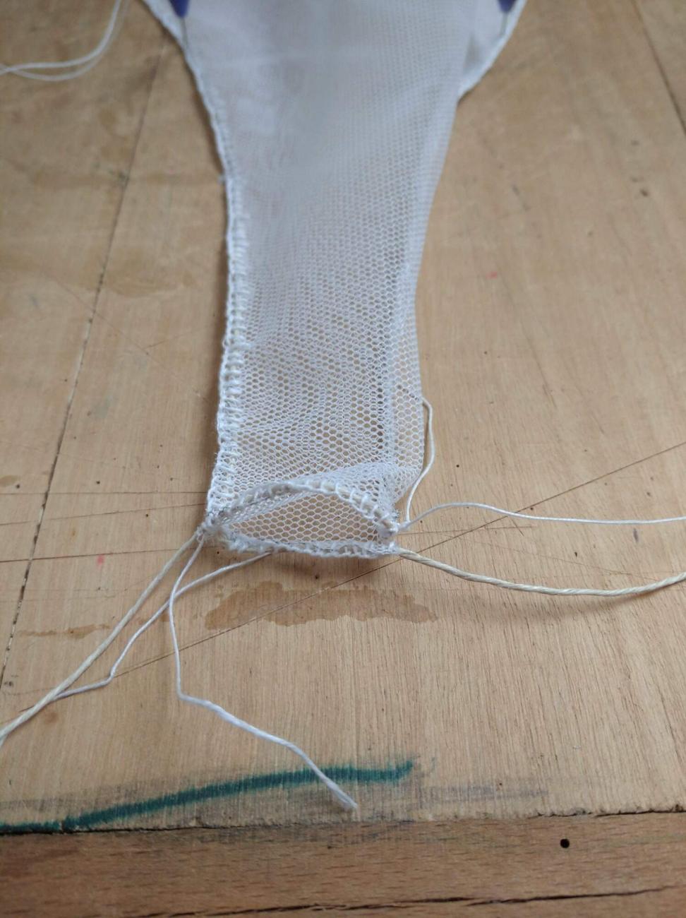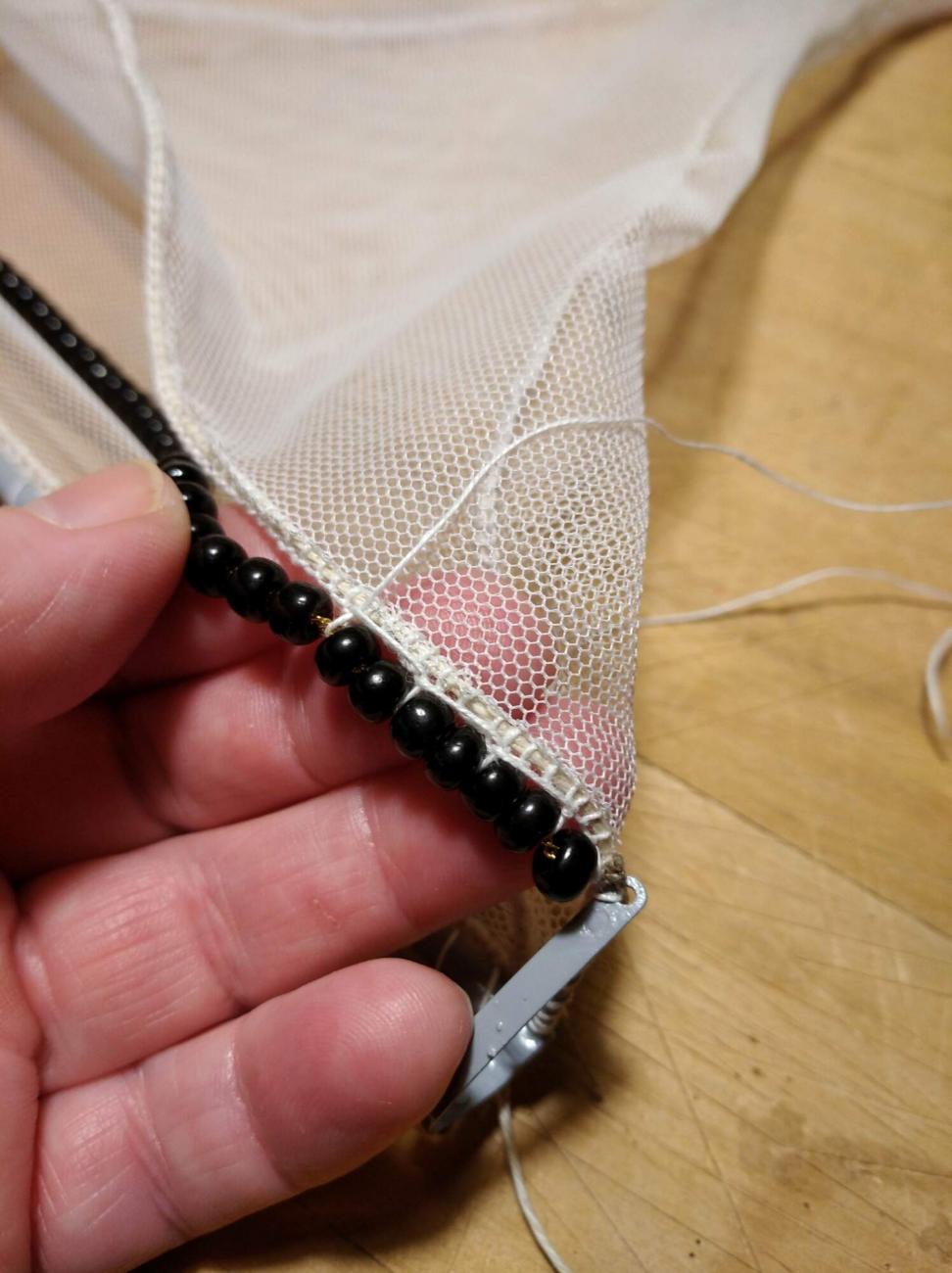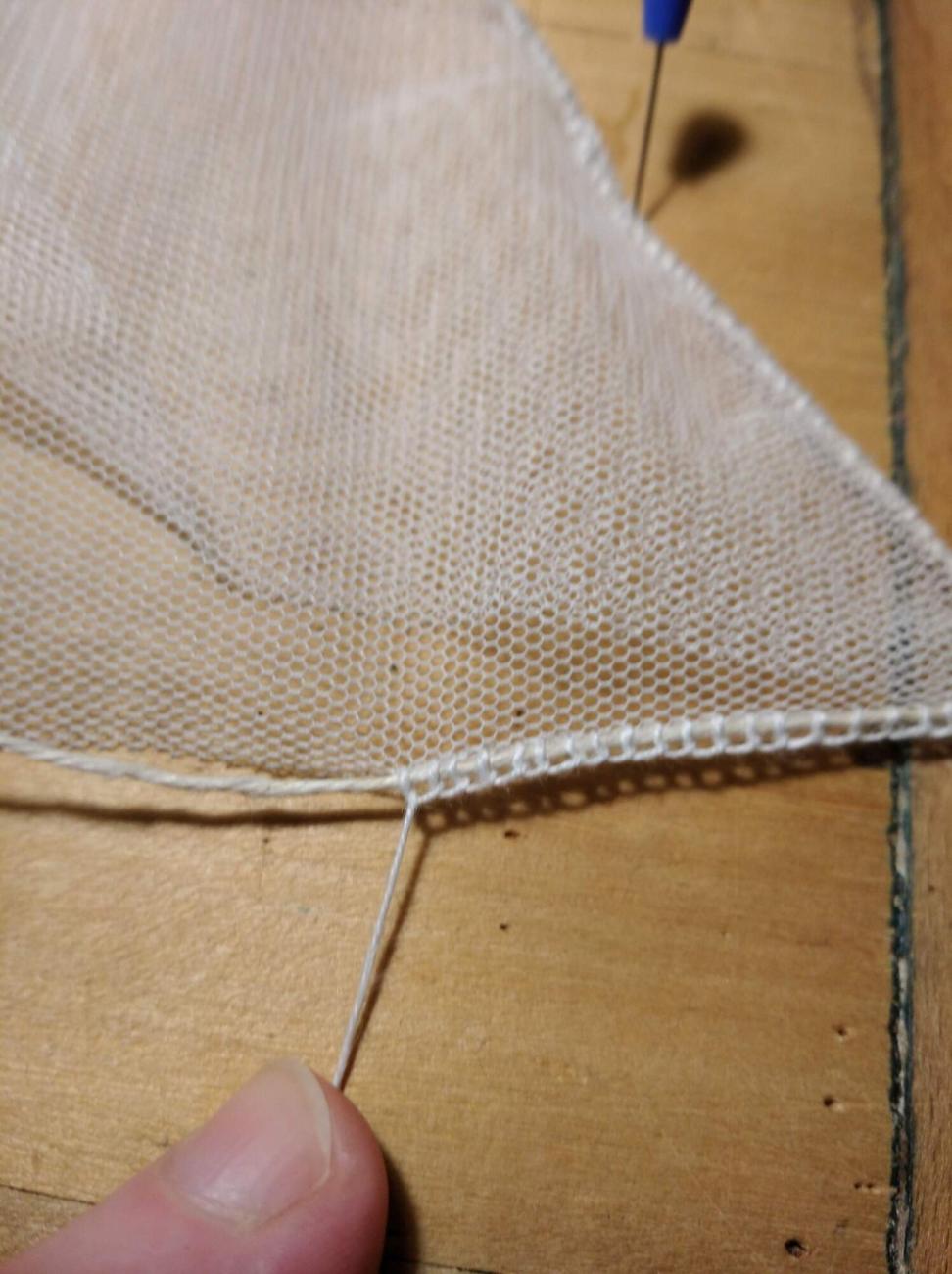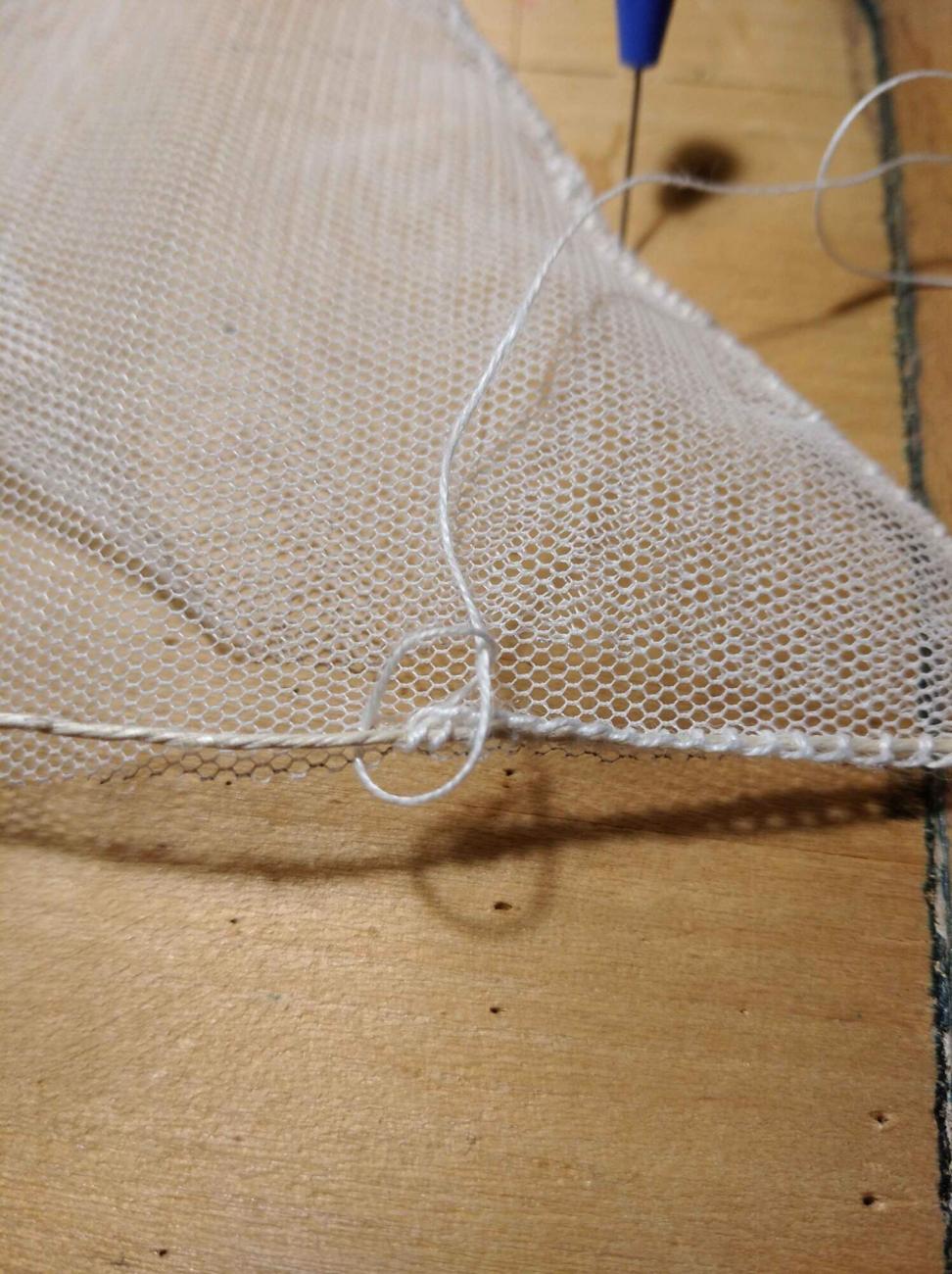 A proč jsem vlastně sítě sám nešil, ale ušila je moje manželka? První síť jsem sice ušil kompletní, ale bohužel jsem zvolil špatný postup. Lano po obvodu jsem totiž u lovícího otvoru sítě (u obručí ráhna nesoucí sítě) přišil k spodnímu dílu sítě, u druhé obruče se vrátil zpět a sešil zase oba díly sítě k sobě. Bohužel to byla slepá cesta, celá síť se mi kroutila. Nelíbilo se mi to a tak jsem svoje šití celé vypáral. Po poradě s manželkou jsme přišli, jak to asi má být správně – lemovací lano 0,7 mm musí jít jen po obvodu horní straně sítě. U lovného otvoru bude druhé lano jen kolem obručí a na lemu spodního dílu sítě. Manželka se šití nakonec ujala sama a za 3 večery byly obě sítě hotovy a přišity k obručím ráhen (omlouvám se, ale nenašel jsem přesné české názvosloví pro tato ráhna a obruče těchto sítí).